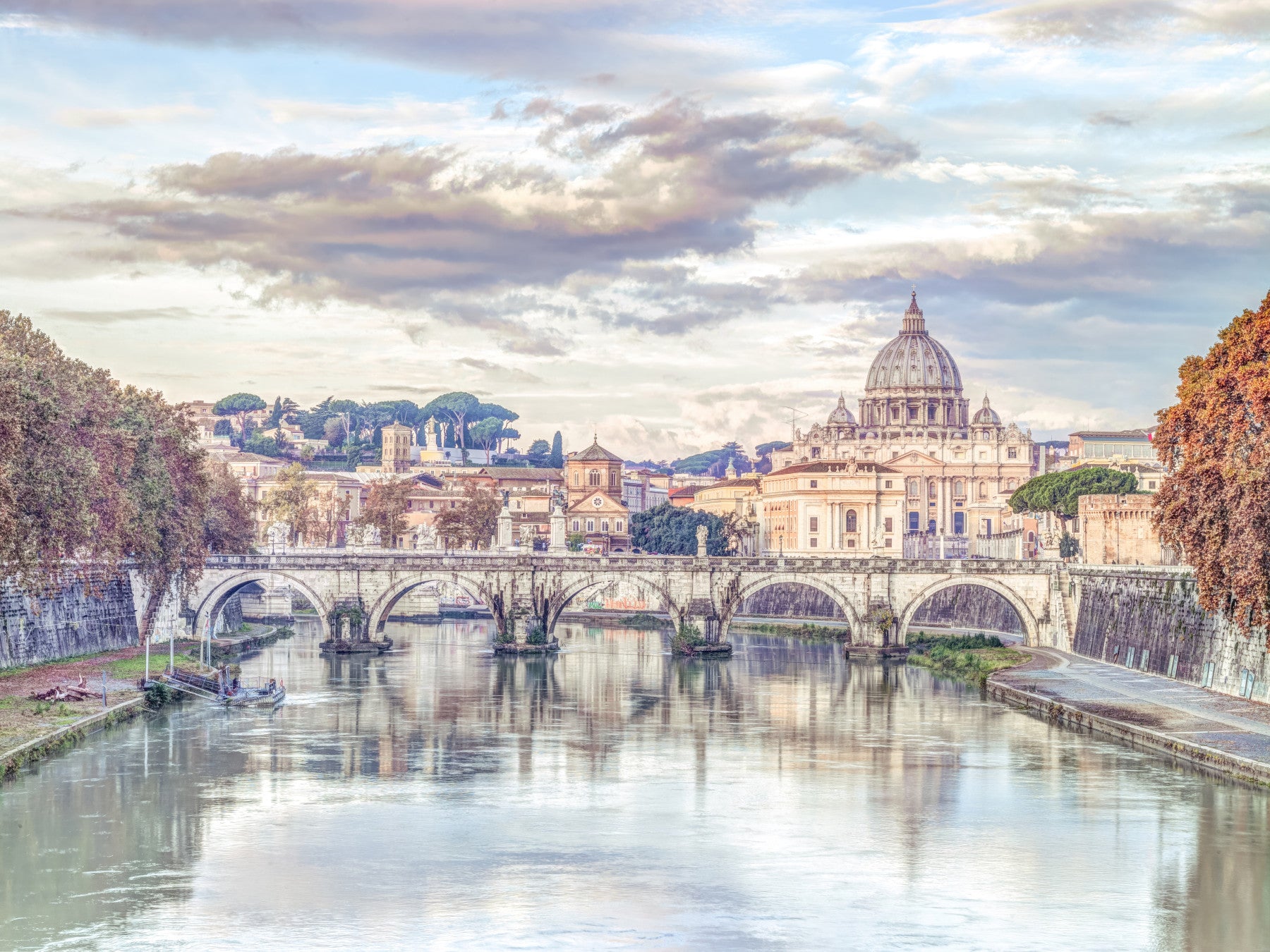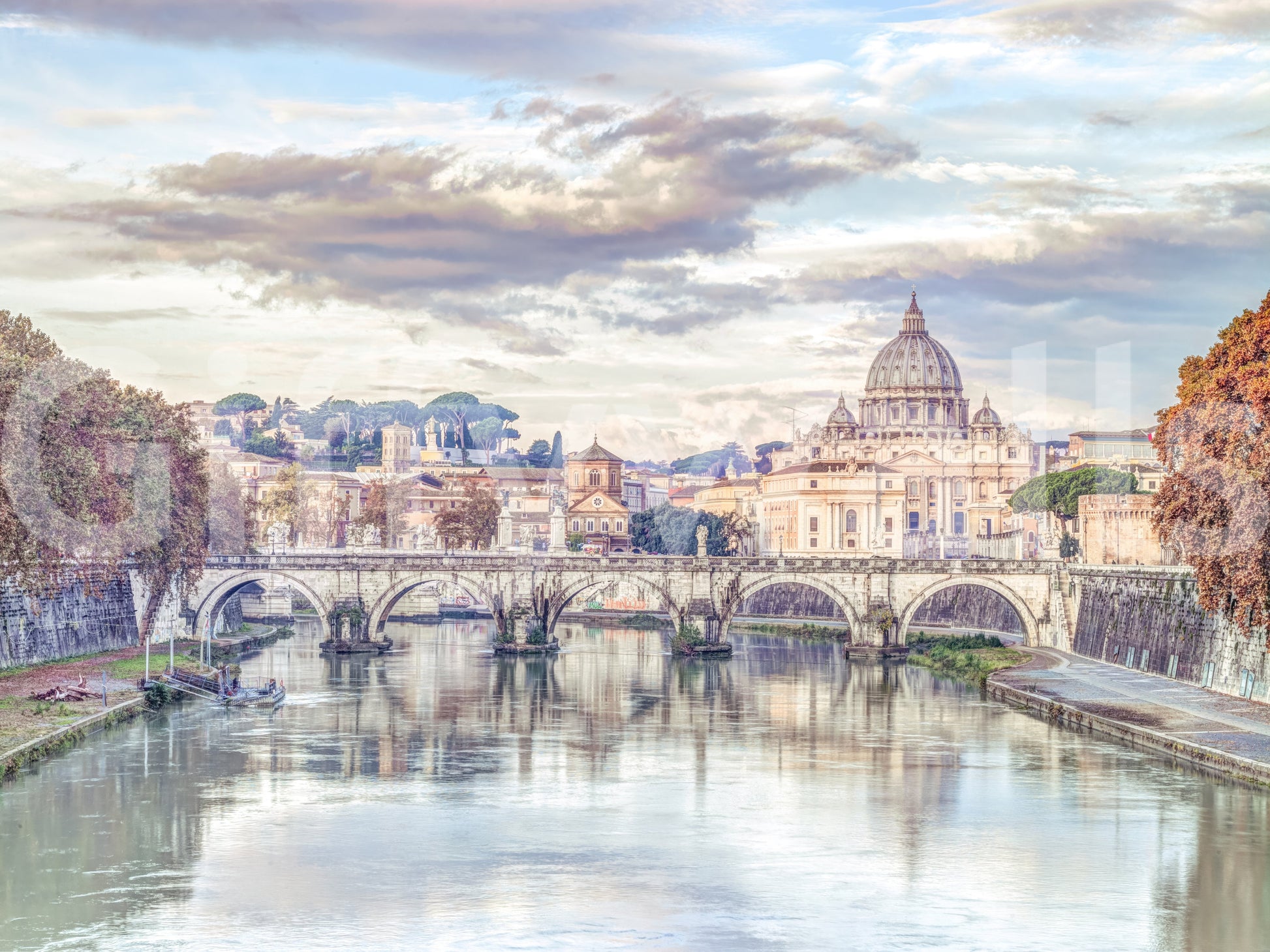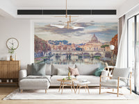 View of Basilica di San Pietro in Vatican, Rome, Italy. Capture the timeless grandeur of Rome with this breathtaking depiction of the Basilica di San Pietro. This image transports you to the heart of Vatican City, showcasing the iconic dome rising majestically above the Roman skyline. A historic bridge gracefully spans the tranquil waters, its arches reflecting the soft, ethereal light of the sky. The scene is bathed in a warm, muted palette, lending an air of serenity and reverence to the surroundings. The composition expertly balances the architectural marvels with the natural beauty of the landscape, creating a visual masterpiece that evokes a sense of history, art, and spiritual significance. Elevate your living space with this stunning tribute to one of the world's most iconic landmarks, adding a touch of Roman elegance and timeless beauty to your walls.
