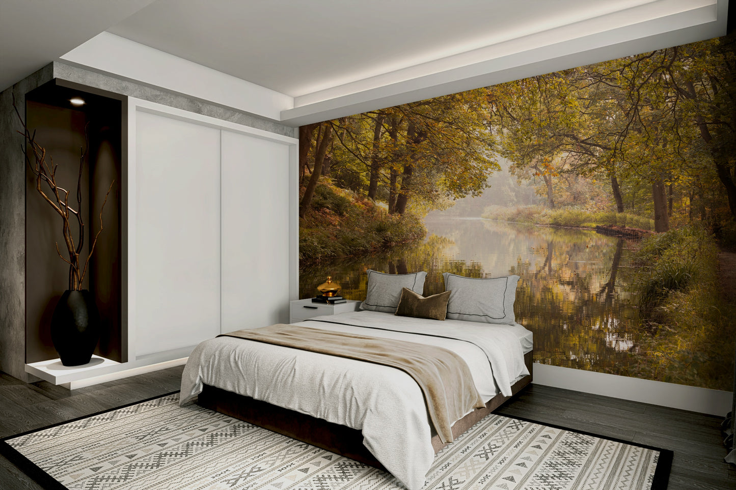 Basingstoke Canal Wall Mural captures the tranquil beauty of a canal framed by tall trees with their reflection mirrored in the still water. This mural wallpaper brings the calming atmosphere of nature into your space, ideal for living rooms, bedrooms, or study areas. The soft golden hues of the leaves and the peaceful water offer a sense of serenity, while the natural path invites relaxation. Perfect for those who love nature-inspired decor, this wall mural enhances spaces with its sense of peace and connection to the outdoors. A beautiful wallpaper for walls designed to evoke calmness and natural elegance.