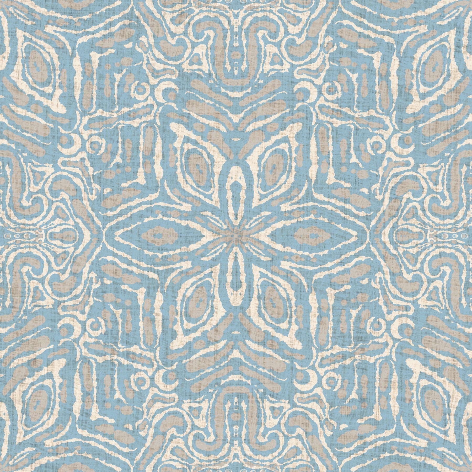 The design features a captivating interplay of muted blues, creams, and taupes, creating a calming and sophisticated aesthetic. Inspired by traditional batik techniques, the pattern showcases a geometric floral motif, with organically flowing lines and shapes forming a mesmerizing, symmetrical kaleidoscope. The subtle texture adds depth and visual interest, bringing a touch of artisanal charm to any l space.