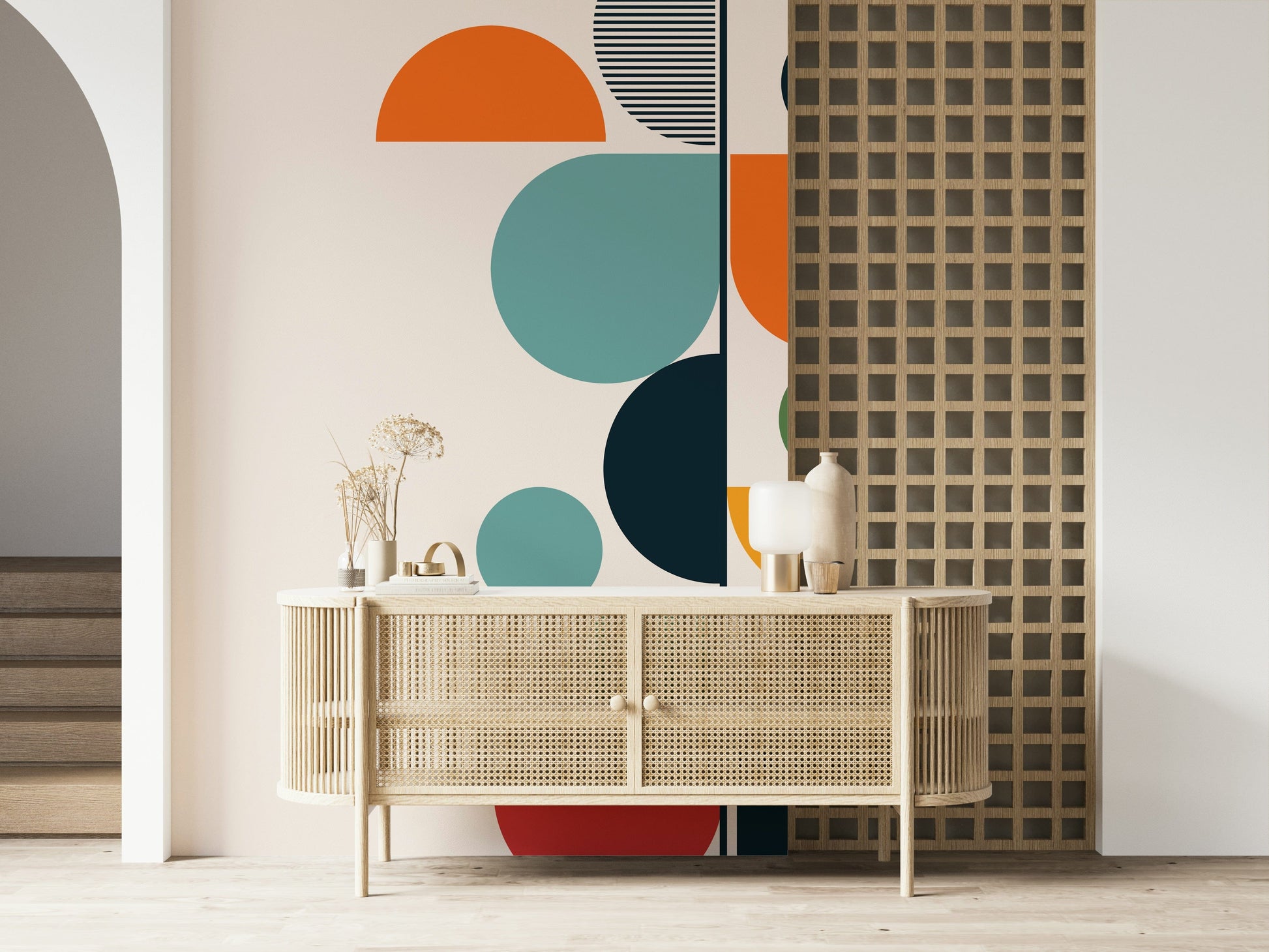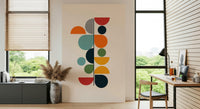 Embrace the essence of rejuvenation with 'Bauhaus - Spring', a striking geometric design that embodies the spirit of renewal. This composition of clean lines and bold circular forms captures the Bauhaus aesthetic with a touch of seasonal vibrancy. Hues of sunny orange, warm red, and earthy green are juxtaposed with calming teal and deep blues, evoking the awakening of nature. The deliberate arrangement of semi-circles and full circles creates a dynamic visual rhythm, drawing the eye upward, reminiscent of new growth reaching for the light. A subtle striped detail adds a layer of texture and visual interest to this modern piece. Bring the fresh, optimistic energy of spring into your living space with this unique wall décor, ideal for creating a focal point that is both timeless and contemporary.