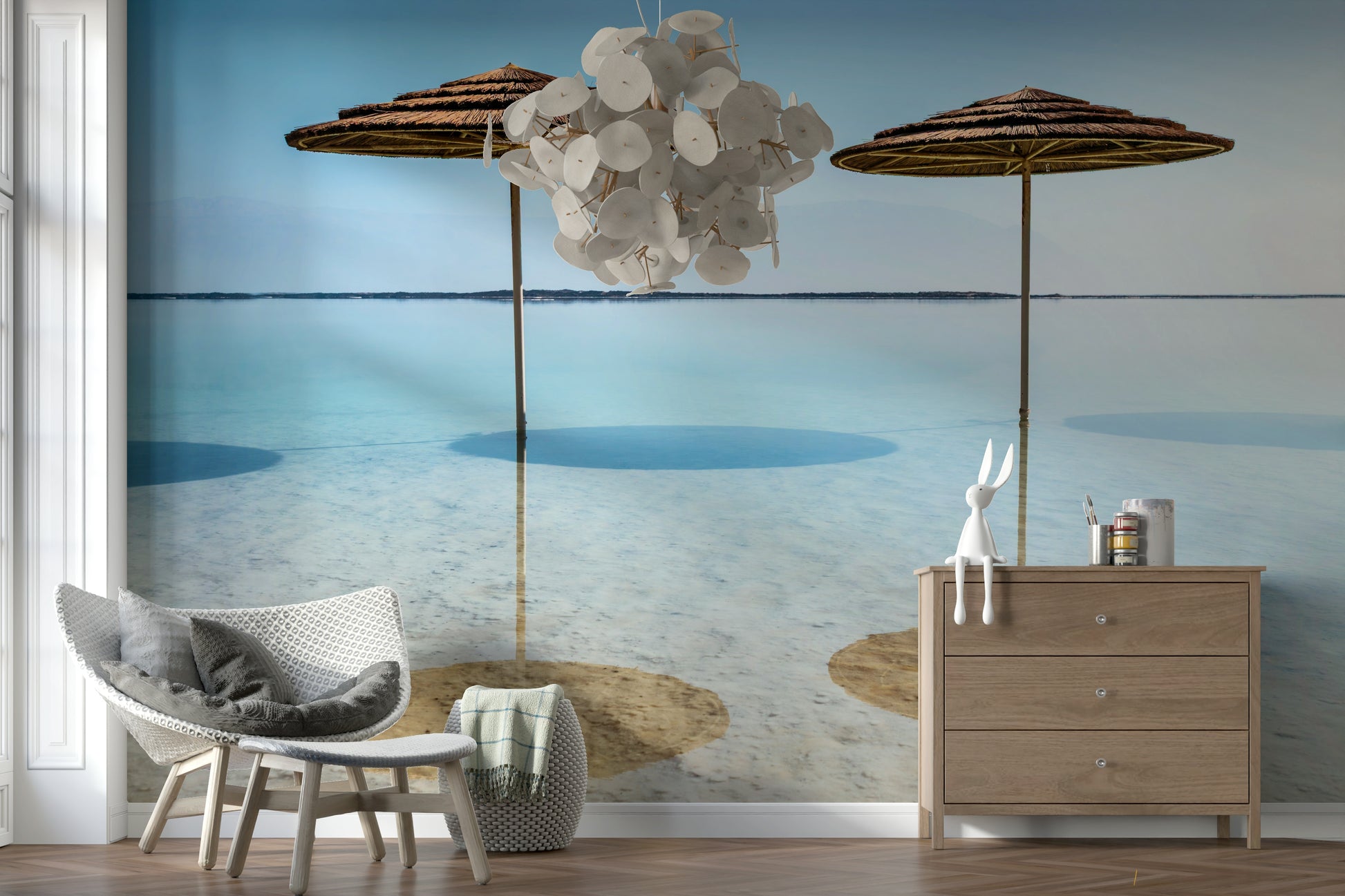 Beach parasol, Dead Sea, Israel. Escape to a serene coastal haven with "Beach Parasols," a tranquil wallpaper that captures the essence of a peaceful seaside retreat. This image features two meticulously crafted, thatched-roof parasols standing gracefully in the shallow, shimmering water of an exotic beach. The soft, turquoise hues of the water blend seamlessly with the clear, cloudless sky, creating a calming and visually stunning backdrop. Delicate reflections of the parasols dance on the water's surface, adding depth and a touch of ethereal beauty to the scene. In the distance, a faint silhouette of mountains completes the picturesque vista. "Beach Parasols" is perfect for bringing a sense of relaxation, warmth, and wanderlust to any space, offering a daily escape to a tranquil paradise.