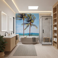 Bring the beach to your walls with this stunning vista. Imagine warm sands and gentle breezes within your living space! This captivating wallpaper for walls features towering palms against the backdrop of a peaceful ocean, transforming any room into a tranquil retreat. The calming colours—blues, greens and browns—harmonise to establish a relaxing atmosphere, perfect for the bedroom or study. The wallpaper’s clean composition and natural beauty elevate the ambience of a room. Embrace this design to complement light-coloured furnishings and natural textiles.