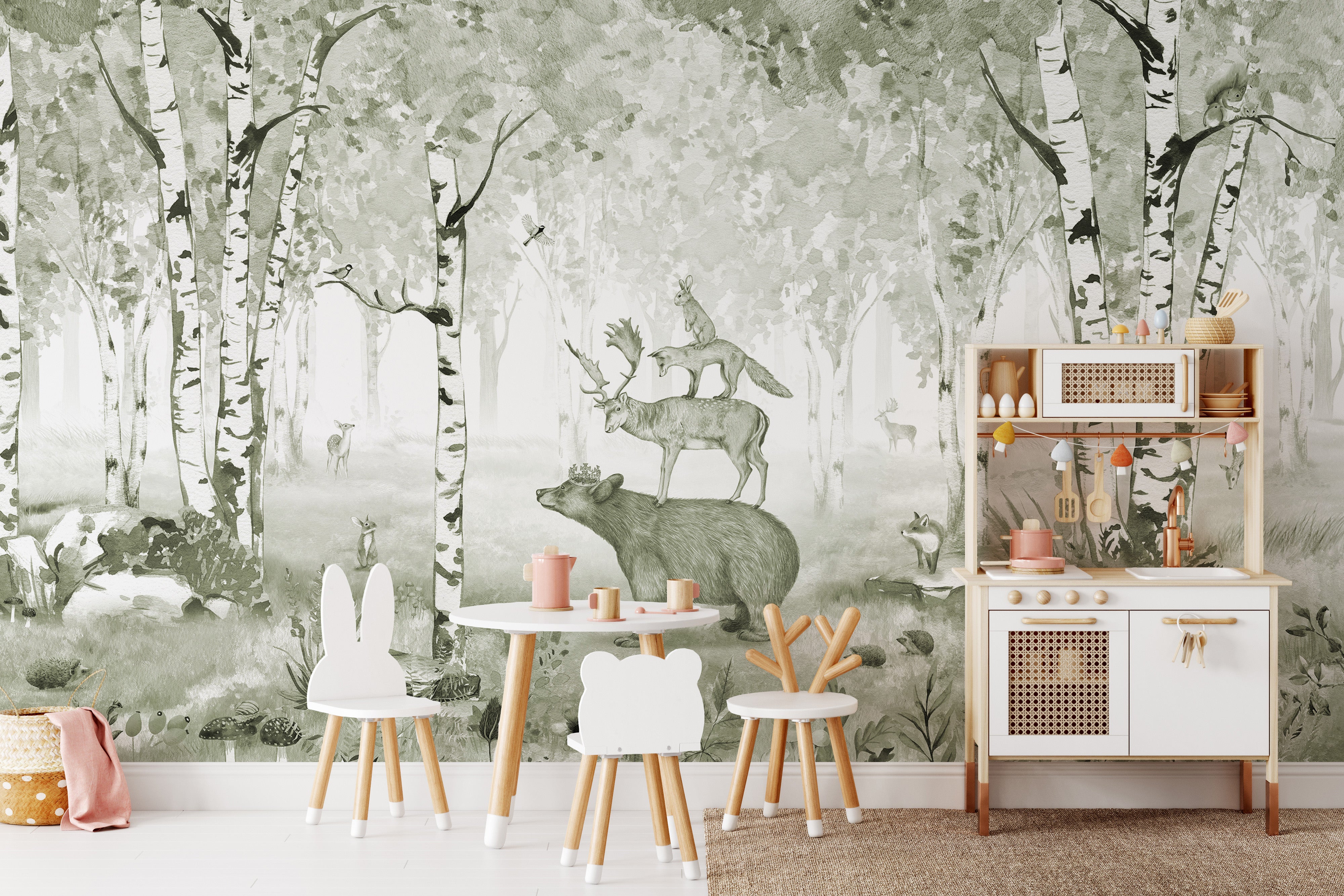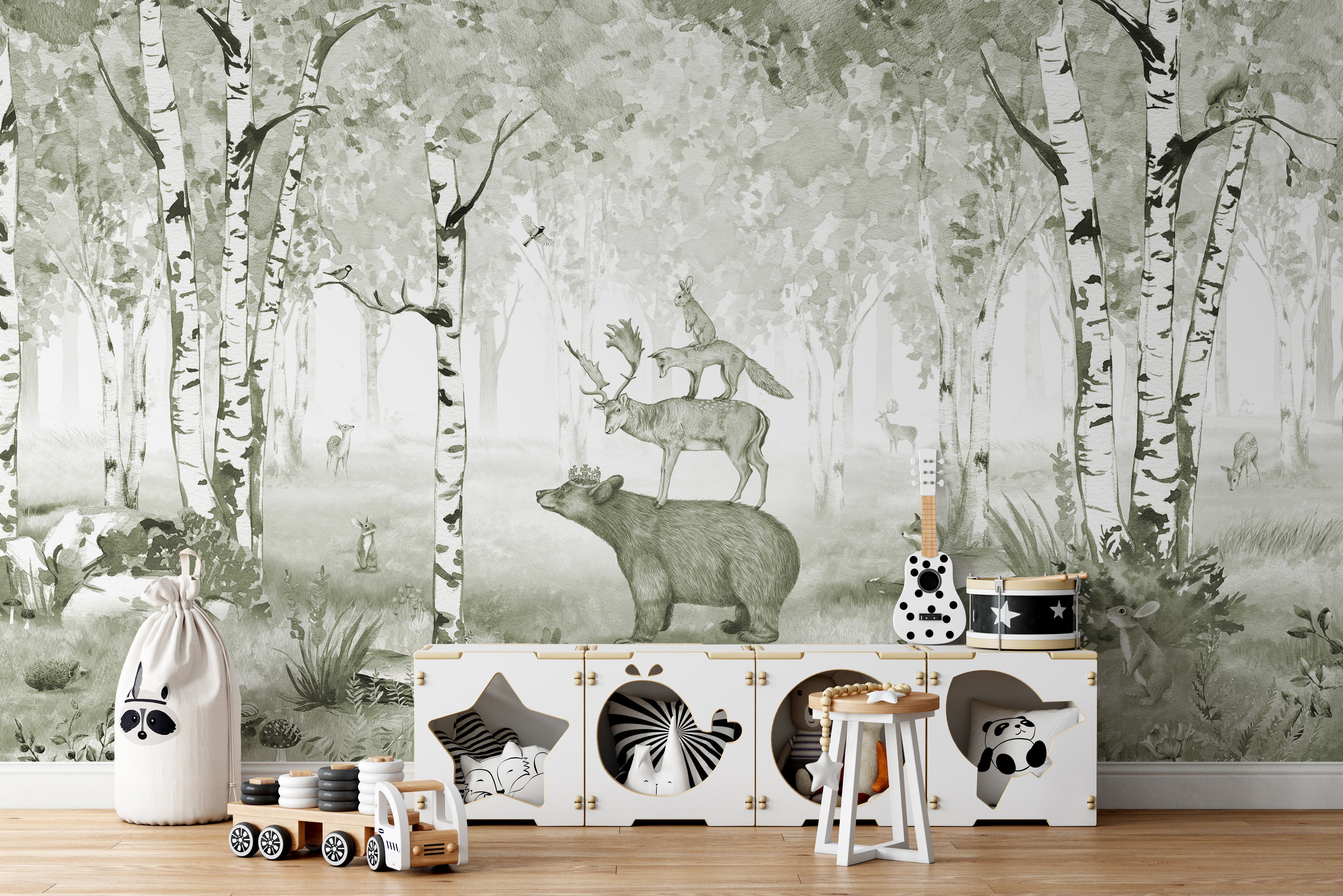 Green bear king mural with woodland creatures and birch trees