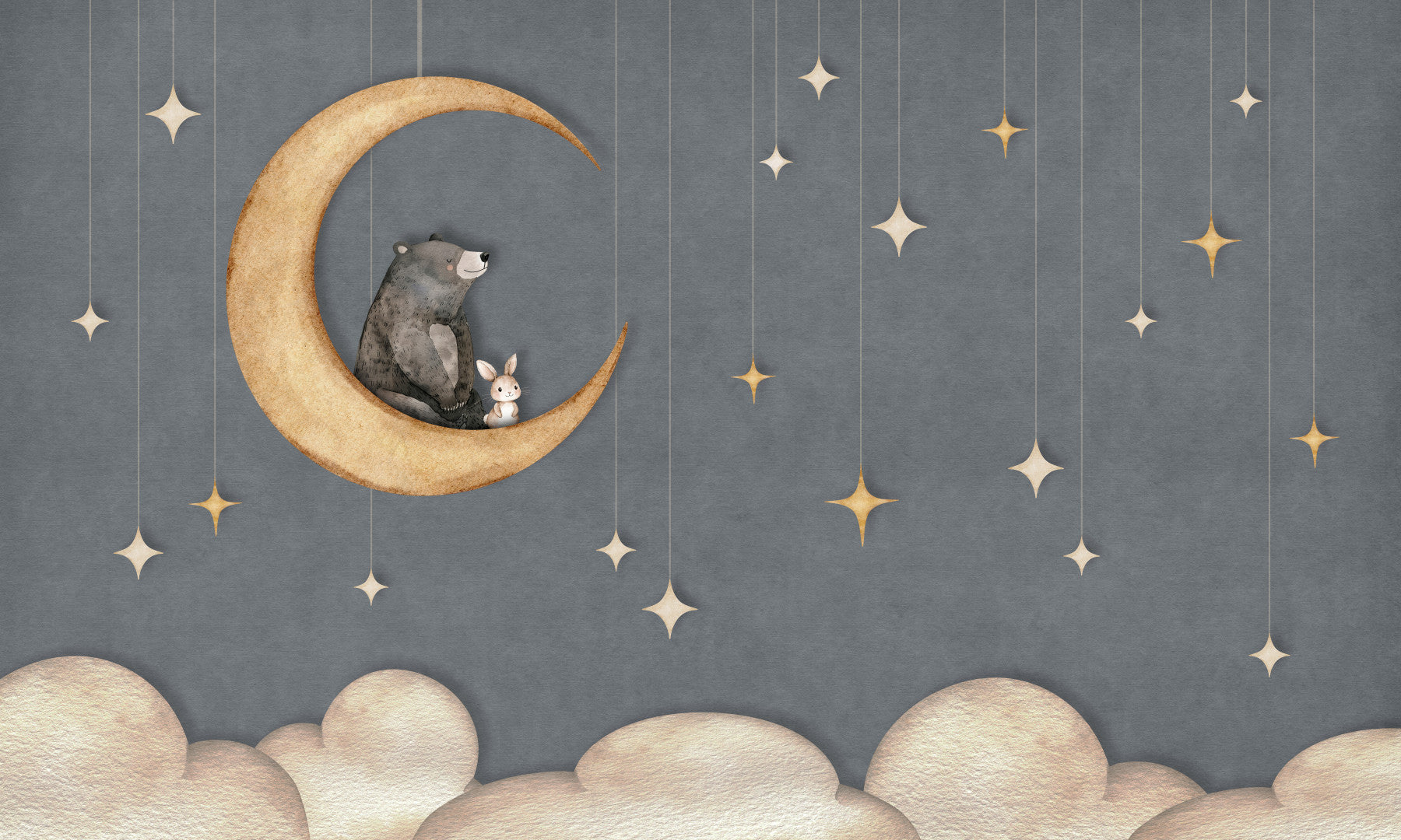 A night-inspired scene defines Bear on The Moon Blue Wall Mural, where a gentle crescent moon holds a bear and rabbit against a deep blue sky filled with hanging stars. The composition blends soft grey-blue tones with warm beige moon details, creating a balanced wall surface with a calm visual feel. The suspended star elements add vertical rhythm, while the cloud base softens the overall layout. This mural fits well in a bedroom, nursery, playroom, or feature wall where a quiet and cozy atmosphere is preferred. The color palette pairs easily with neutral furniture, soft fabrics, and modern interiors. Bear on The Moon Blue Wall Mural suits spaces that need a simple night-sky theme with soft character and a clean illustrated finish.