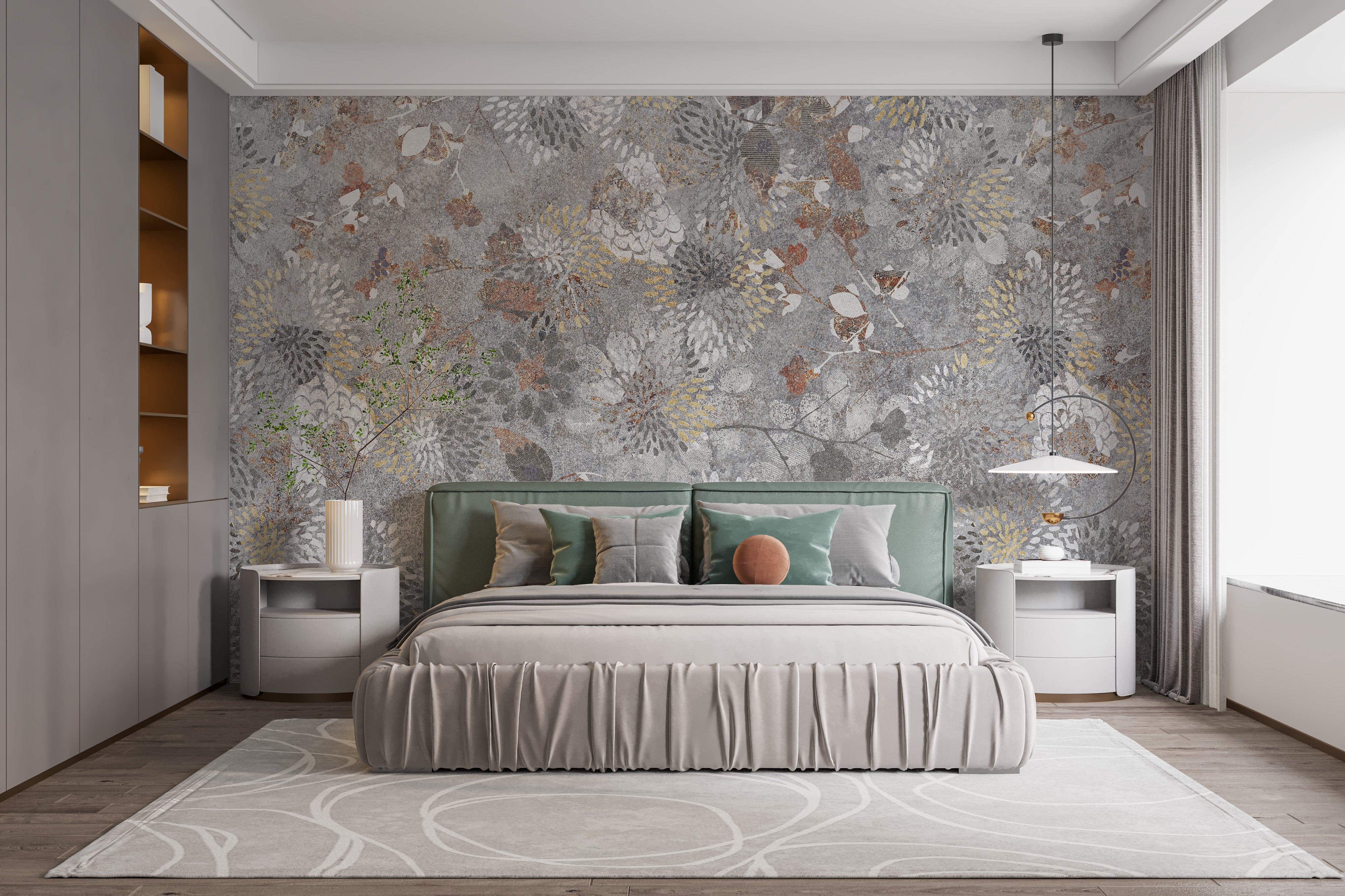 Peel-and-stick DIY wallpaper is of premium quality as it can be removed and applied without fuss—making it perfect for seasonal decor changes or renting. The eco-friendly, non-fading wallpaper is safe around children and pets too. Soft, minimalist furniture and lighting paired with the wallpaper lets the floral flourishes shine.
