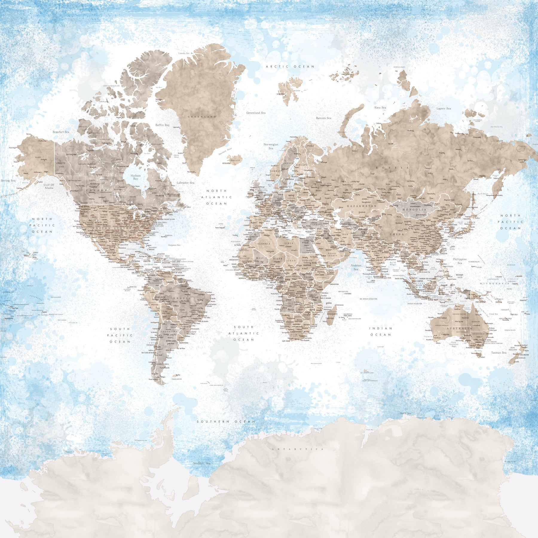 Sky blue and beige watercolor map for nurseries
