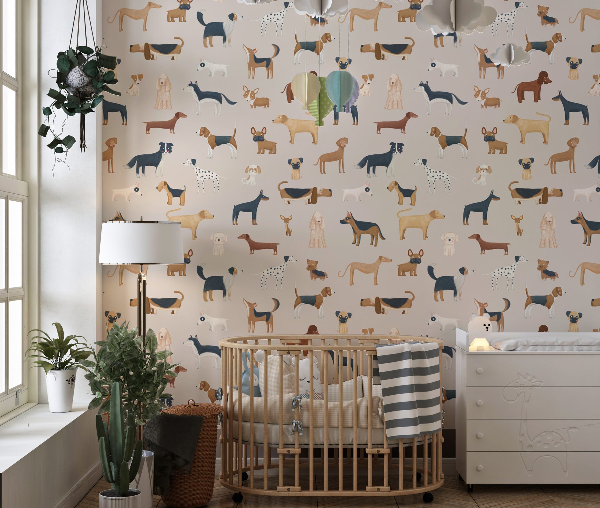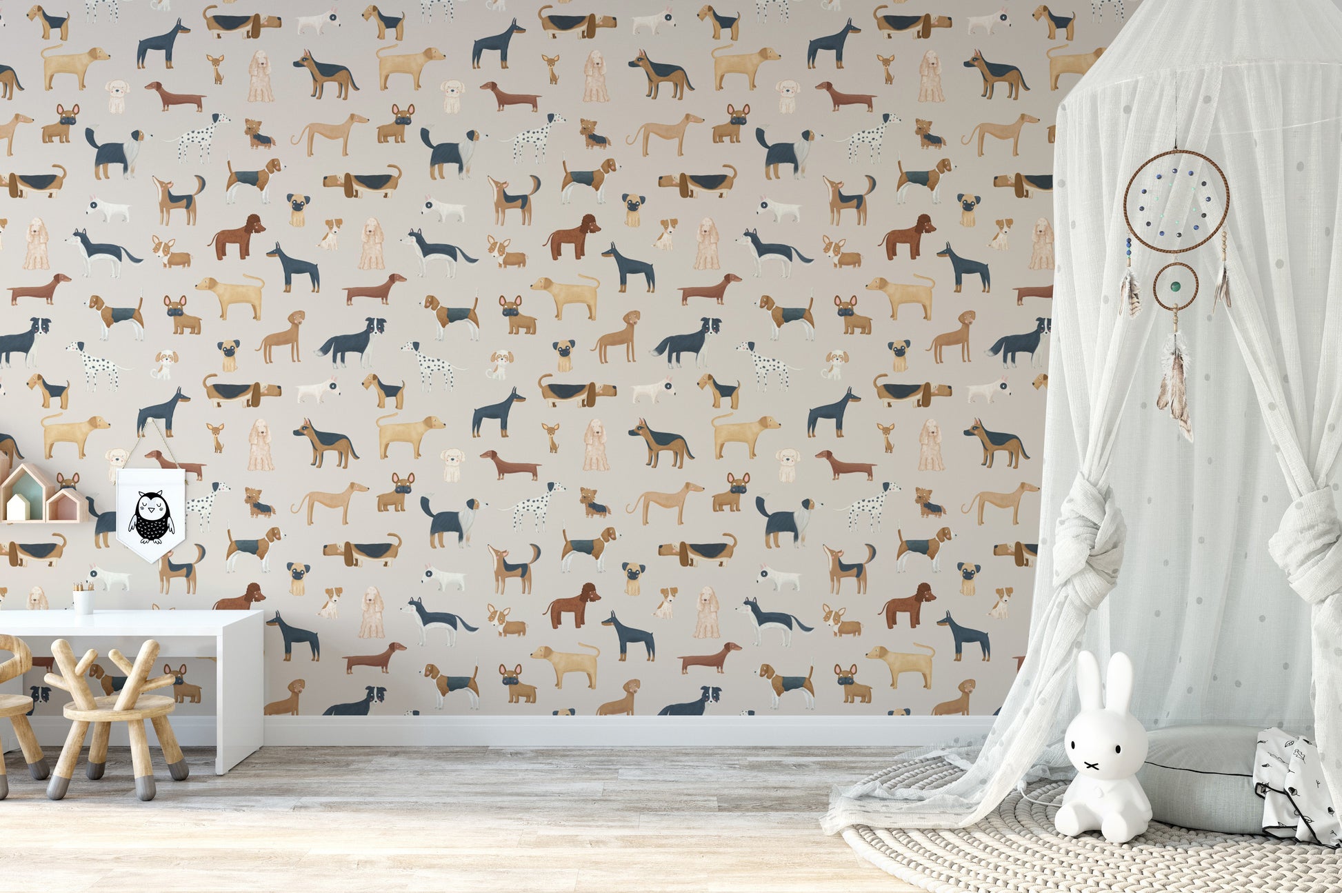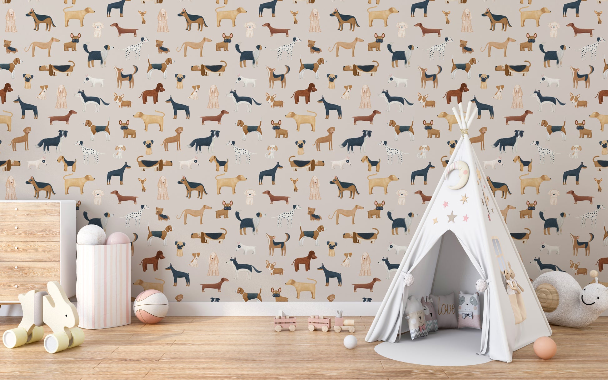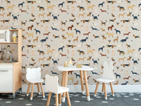 Elevate your child's bedroom or play area with the beige canine parade wallpaper mural. This delightful wallpaper is a celebration of man's best friend, showcasing a variety of playful dog illustrations set against a warm beige backdrop. It's not just visually appealing but also sparks imagination and joy, making it an ideal choice for kids room wallpaper. Crafted with durability in mind, it withstands the energetic lifestyle of little ones. Easy to apply, this mural turns any room into a fun, canine-filled wonderland, perfect for the young and the young at heart.
