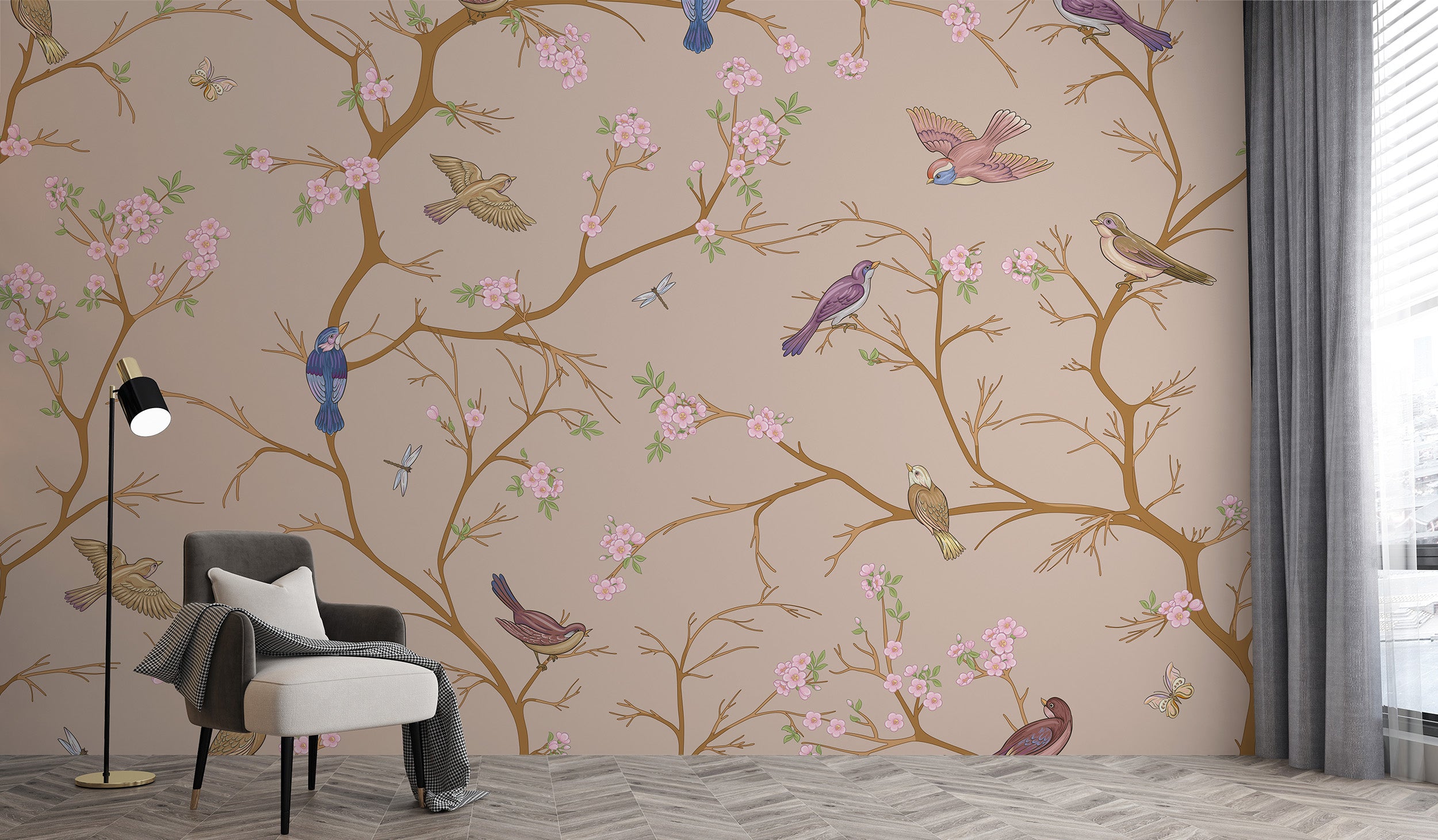 Beige chinoiserie wallpaper adds charm to living spaces
