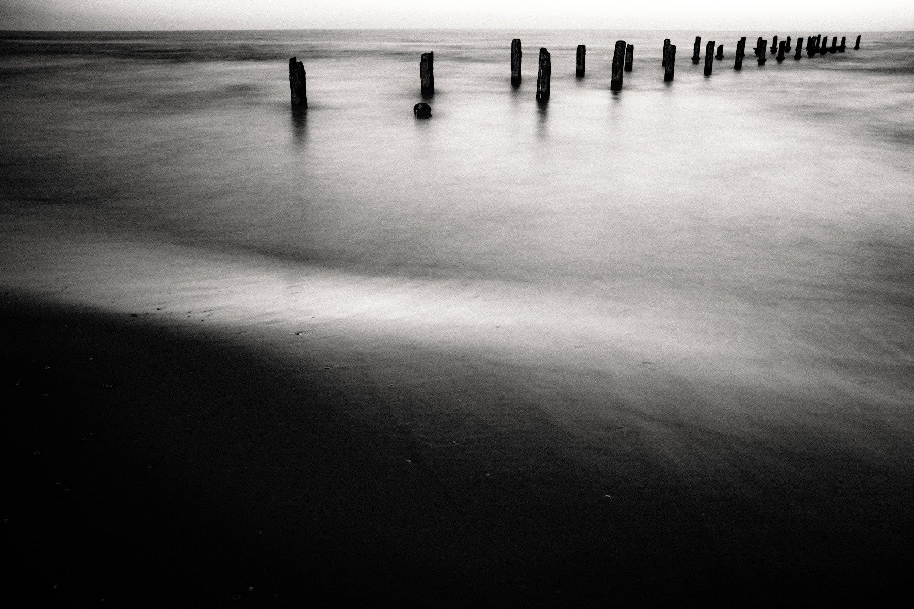 Immerse yourself in the serene stillness of Beit Yanai beach with this black and white wallpaper. 'Beit Yanai beach I' captures a tranquil scene of weathered wooden posts standing steadfast against the gentle caress of the sea. The long exposure creates a milky, ethereal quality in the water, blurring the line between sea and sky. The stark contrast and minimalist composition evoke a sense of calm and introspection, perfect for creating a peaceful atmosphere on your device. Let the rhythmic ebb and flow of the unseen waves wash over you, transporting you to the quiet shores of Beit Yanai, a place where time seems to slow and the soul finds solace. A timeless and captivating visual escape for your screen.