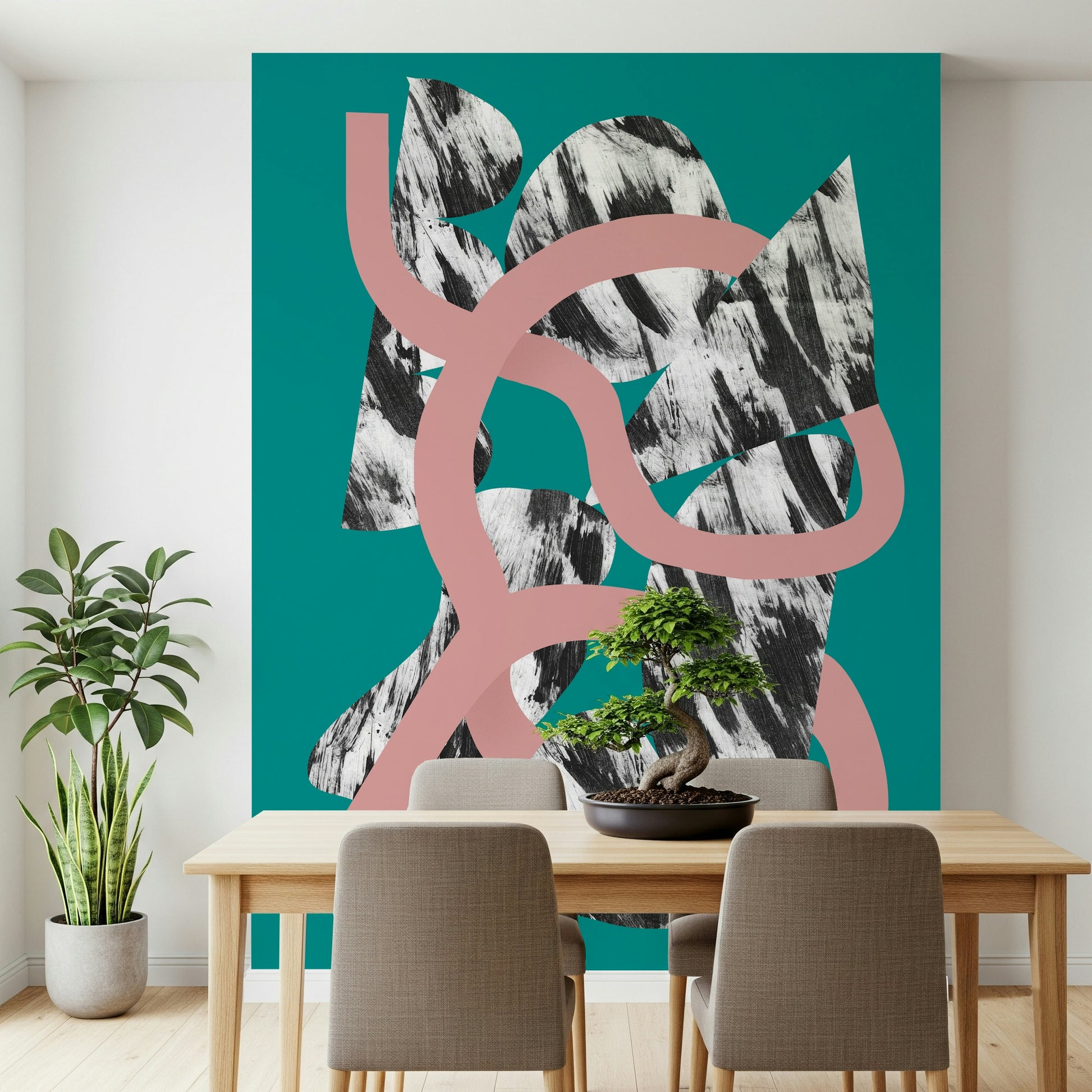 Entangled in captivating complexity, "Big Knot" presents a modern abstract composition that is both visually stimulating and calming. A playful knot of coral-pink lines intertwines with fractured, textured shapes in black and white on a teal backdrop. The bold brushstrokes add depth and a sense of raw artistry, contrasting beautifully with the clean lines of the knot. This wallpaper creates a visually stunning focal point on any screen, inviting viewers to get lost in its layers. Perfect for those who appreciate modern art with a touch of sophisticated chaos, this wallpaper exudes creative energy and artistic flair. Install “Big Knot” and transform your digital space into a modern art gallery.