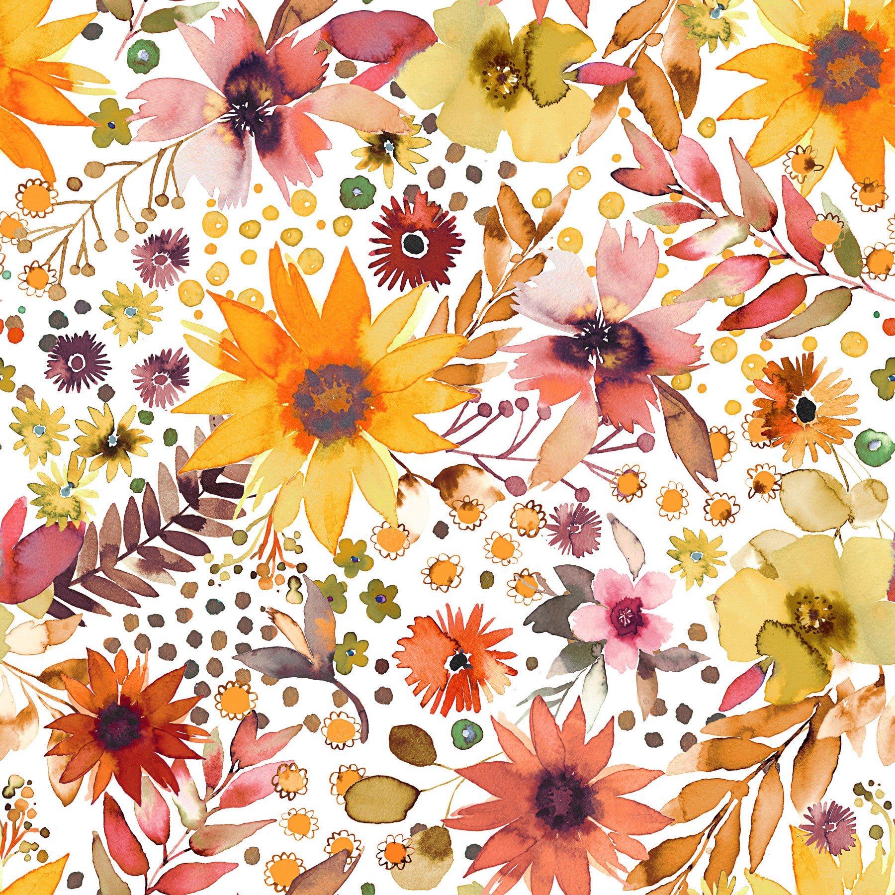 Embrace the warmth and vibrancy of autumn with this stunning wallpaper. 'Big Sunflowers Floral Gold' showcases a breathtaking watercolor design featuring large, bold sunflowers in rich golden hues, interspersed with a medley of smaller blossoms in earthy reds, oranges, and yellows. Delicate leaves and abstract gold accents complete the composition, creating a harmonious and sophisticated aesthetic. The design evokes a feeling of sunny optimism and rustic charm, perfect for adding a touch of nature's beauty to any digital device. The soft watercolor effect provides a calming and elegant atmosphere, ideal for a serene and stylish workspace or home screen.