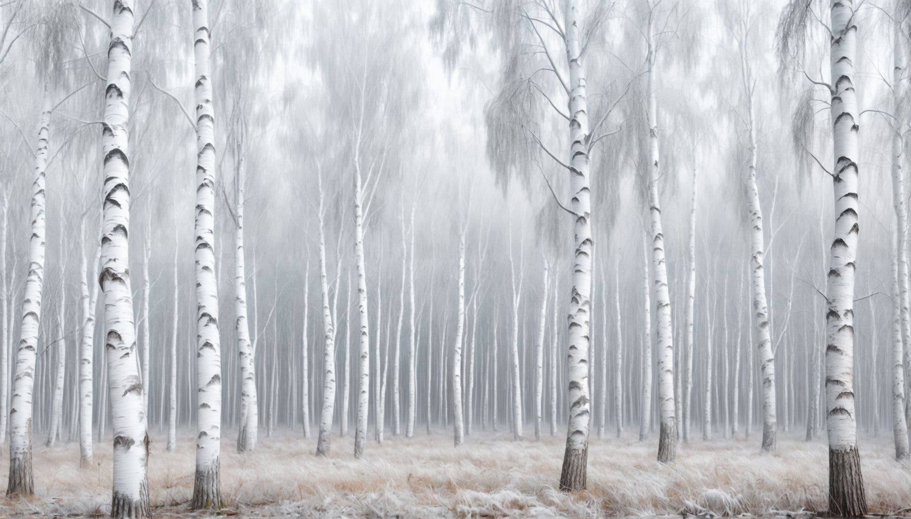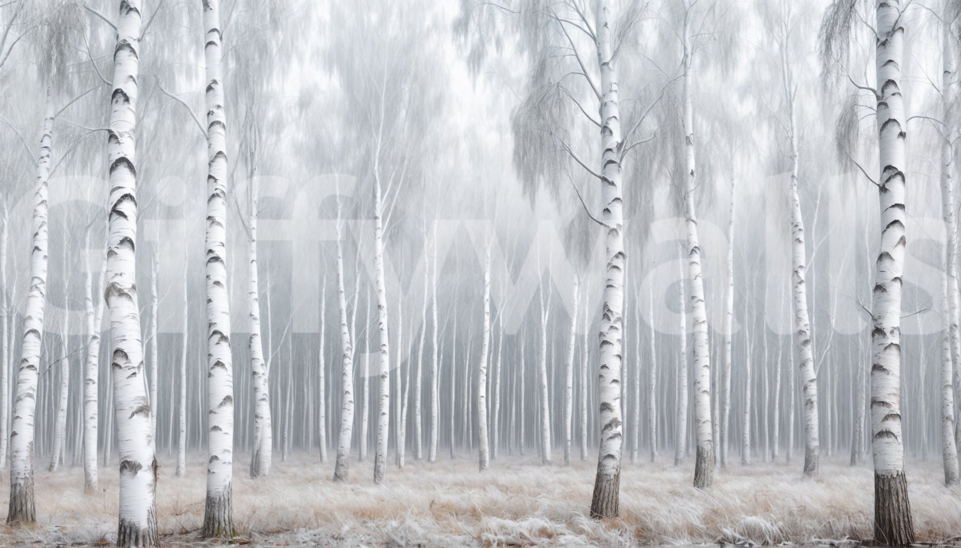 Transform your walls with the serene beauty of 'Birch Whispers'. This elegant wallpaper for walls features a dense birch forest shrouded in mist, creating a tranquil and calming ambiance. The monochrome palette of whites, greys, and subtle browns adds a touch of sophistication to any room. This design works well in bedrooms, living rooms, or hallways, bringing the quiet beauty of nature indoors. It enhances spaces with a sense of depth and tranquility, making it perfect for creating a relaxing atmosphere.