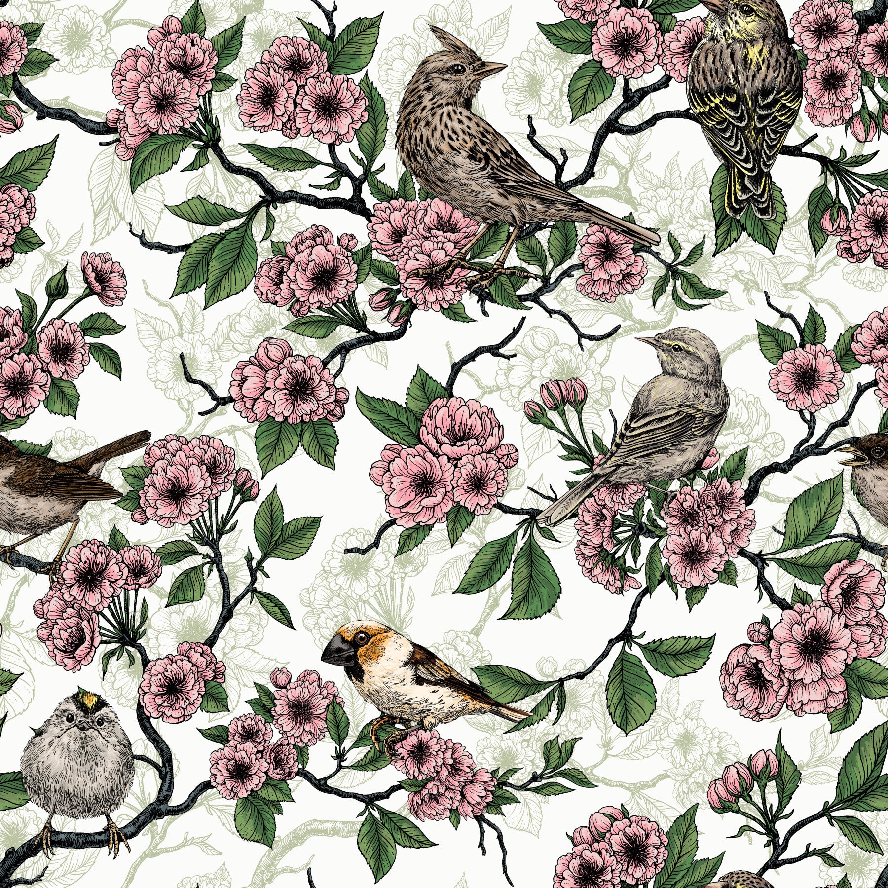 Hand drawn cherry blossom branches with perching birds