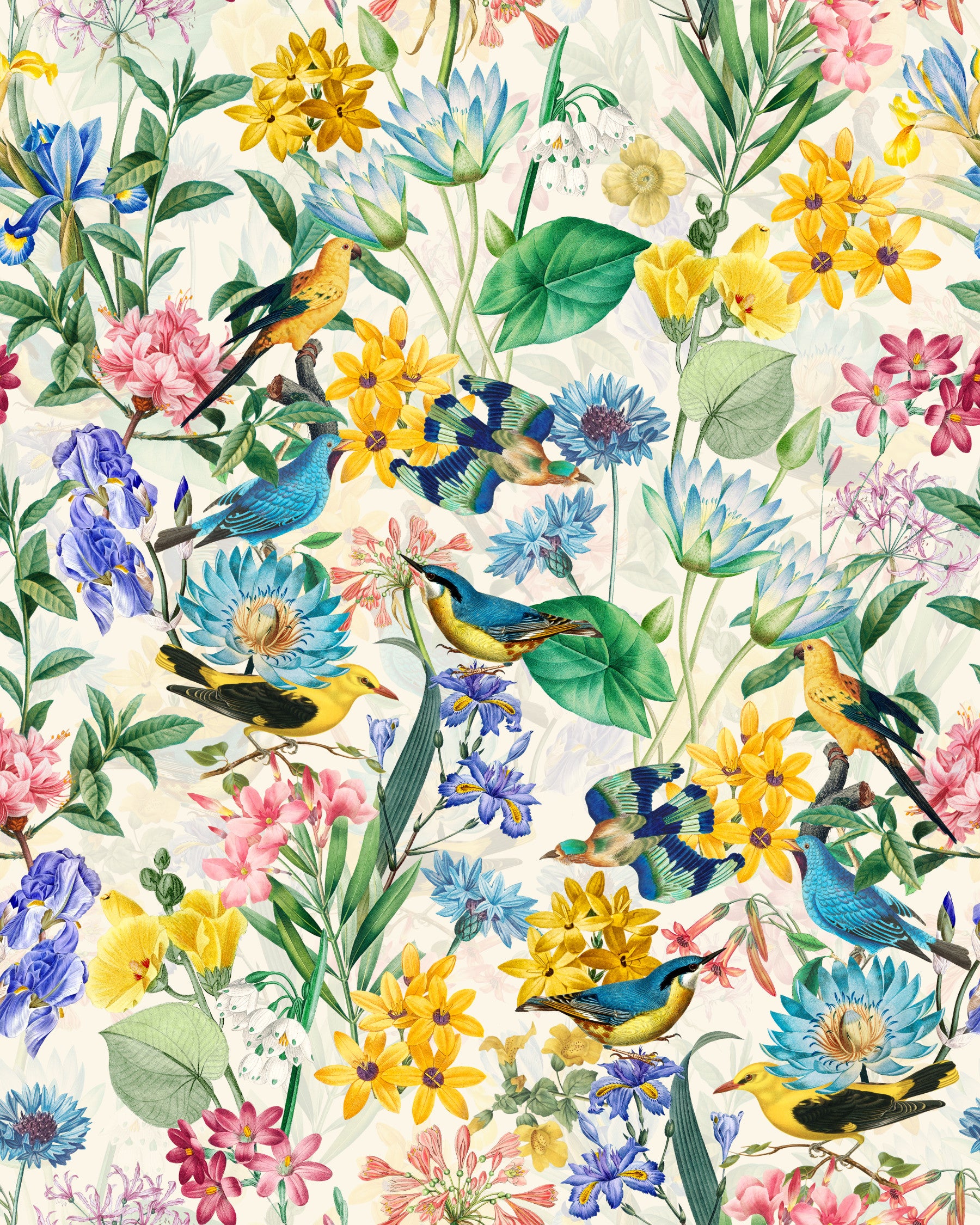 Colorful birds and delicate blooms in Birds & Blooms Symphony wallpaper