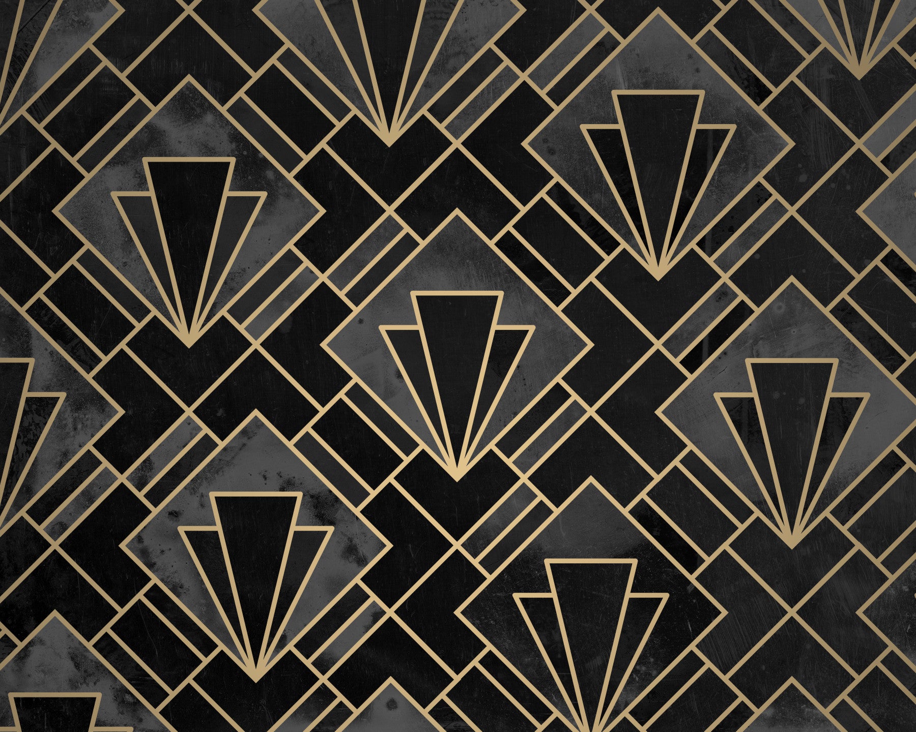Immerse yourself in the luxurious elegance of the roaring twenties with the "Black and Concrete Art Deco Mosaic" wallpaper. This striking design marries the timeless appeal of Art Deco with a modern, industrial edge. The bold geometric pattern, rendered in deep blacks and textured concrete grays, evokes a sense of urban sophistication. Gleaming gold lines intricately trace the iconic sunburst and angular motifs, adding a touch of opulence and glamour. The subtle variations in the concrete-like texture add depth and intrigue, lending a tactile quality to the visual experience. This wallpaper is perfect for creating a dramatic statement wall, adding a touch of vintage charm to a contemporary space, or establishing a sophisticated atmosphere in any room. Elevate your interior with this powerful and stylish expression of architectural artistry.
