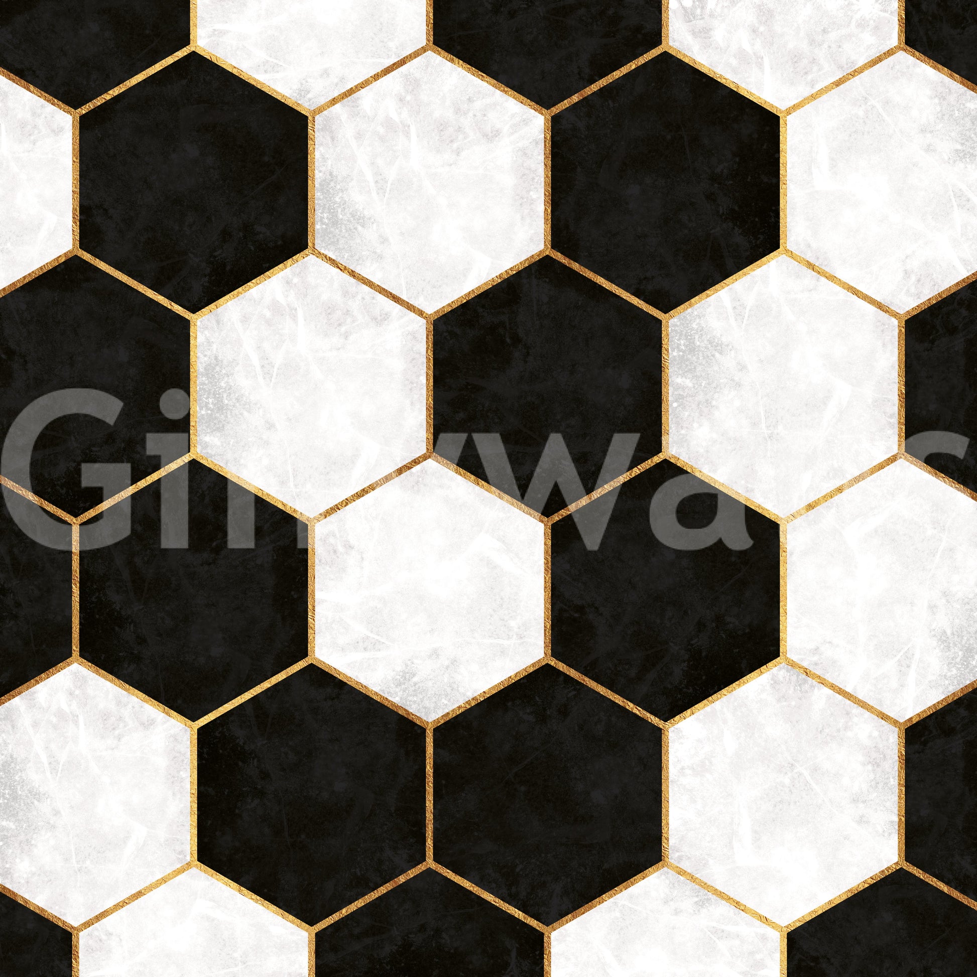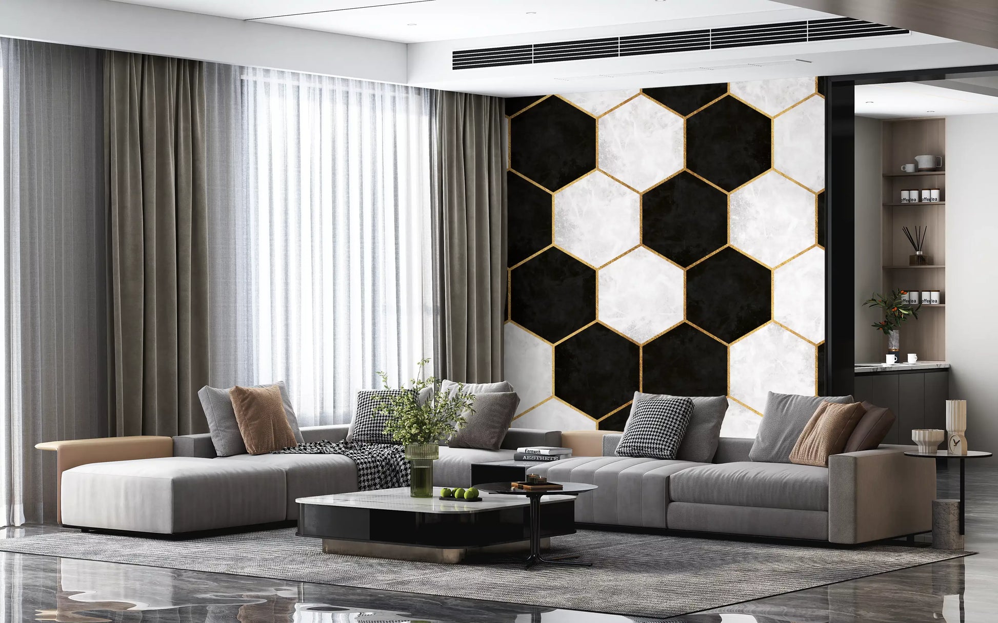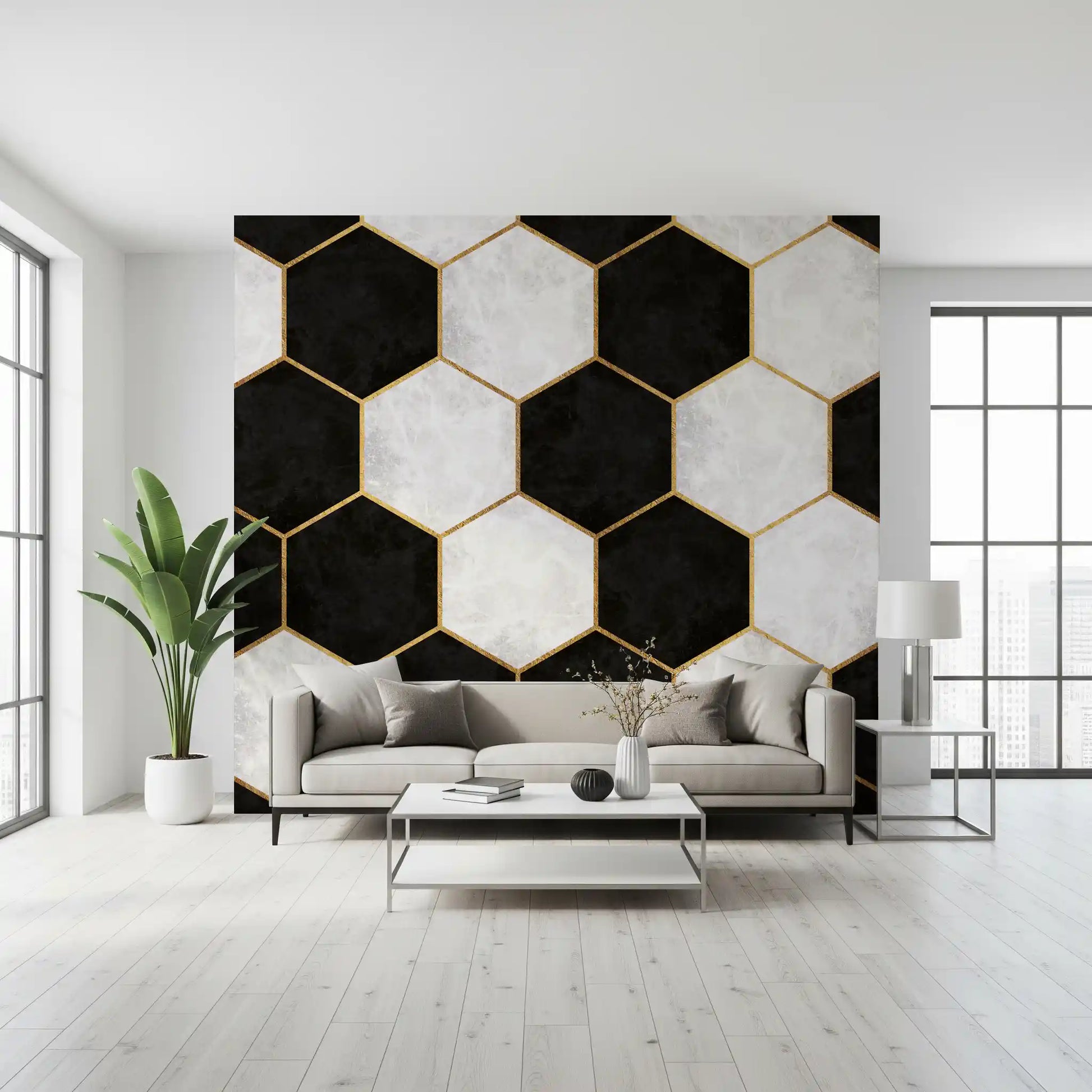 This sophisticated wallpaper transforms any room into a contemporary masterpiece. It features a striking geometric pattern of interlocking hexagons, alternating between deep black and crisp white. Each hexagon showcases a subtle, elegant marble texture, adding depth and organic character to the polished design. Slender, shimmering gold lines meticulously outline every shape, creating a rich contrast that exudes modern luxury. This bold palette and refined pattern instantly elevate living rooms, dining areas, chic offices, or grand entrance halls. The design creates a dynamic focal point, bringing a sense of order and opulent style to your interior spaces. It perfectly complements minimalist, Art Deco, or contemporary décor.