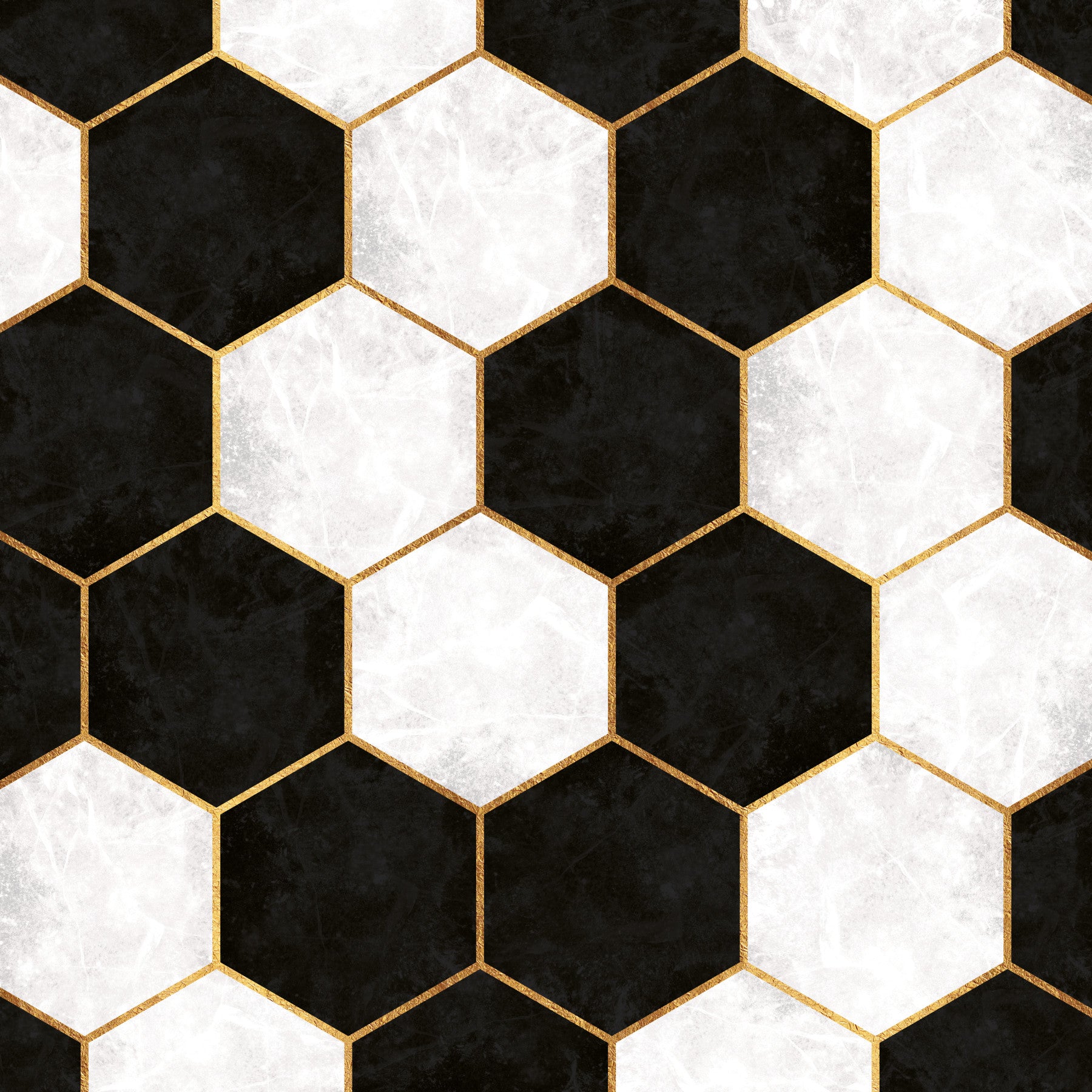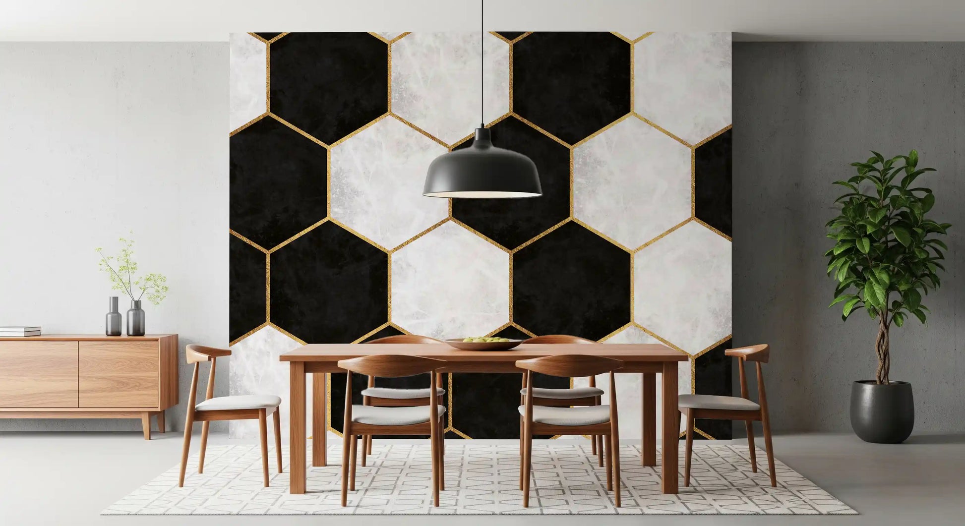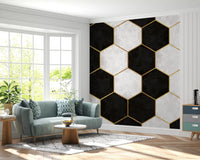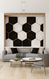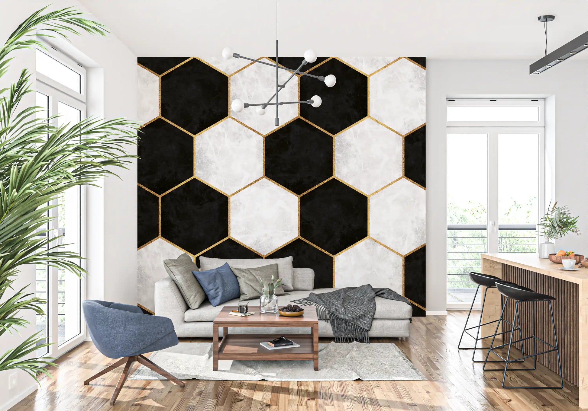 This sophisticated wallpaper transforms any room into a contemporary masterpiece. It features a striking geometric pattern of interlocking hexagons, alternating between deep black and crisp white. Each hexagon showcases a subtle, elegant marble texture, adding depth and organic character to the polished design. Slender, shimmering gold lines meticulously outline every shape, creating a rich contrast that exudes modern luxury. This bold palette and refined pattern instantly elevate living rooms, dining areas, chic offices, or grand entrance halls. The design creates a dynamic focal point, bringing a sense of order and opulent style to your interior spaces. It perfectly complements minimalist, Art Deco, or contemporary décor.