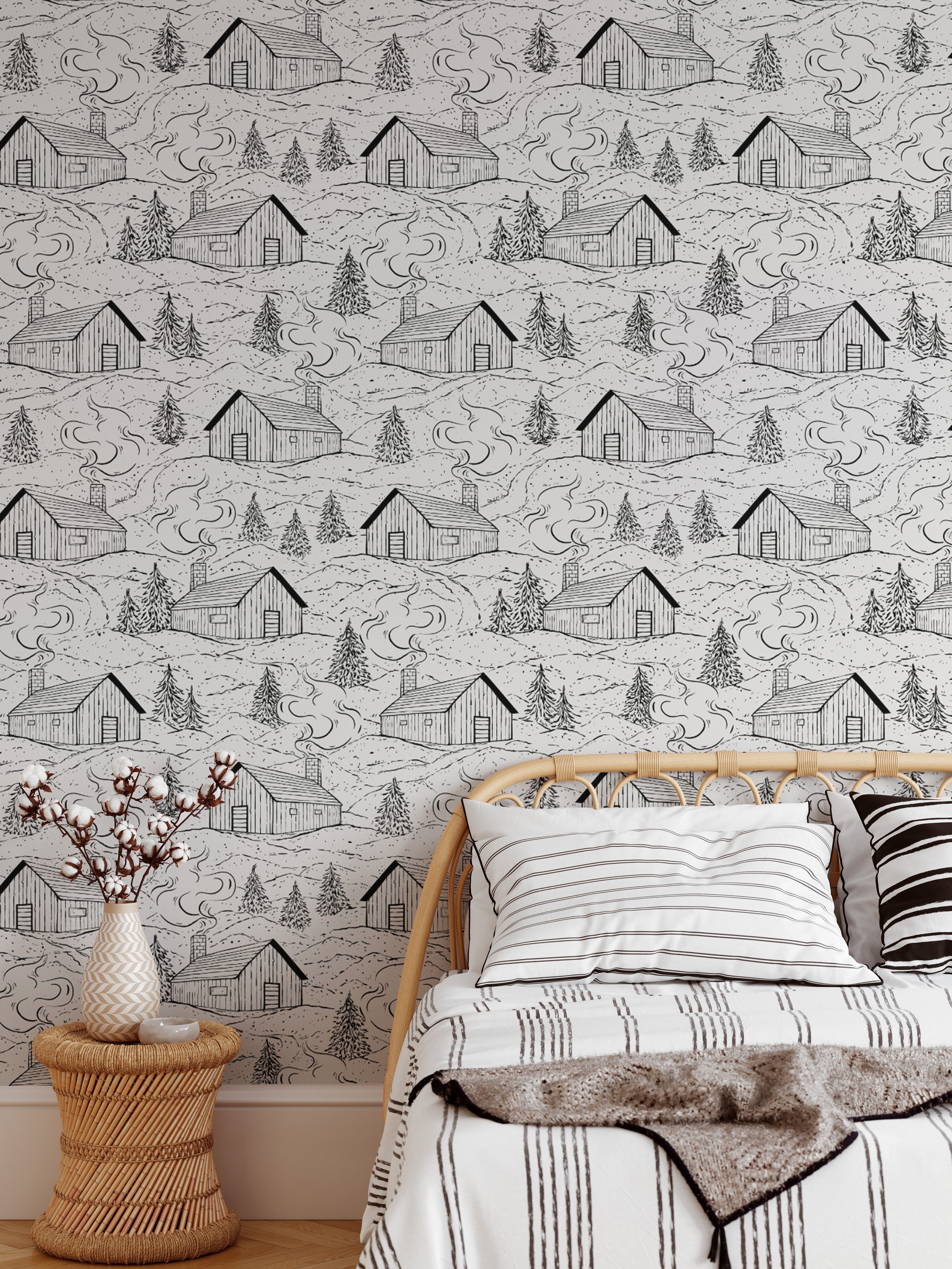 Bold black and white smokey cabin wallpaper for dramatic interiors.