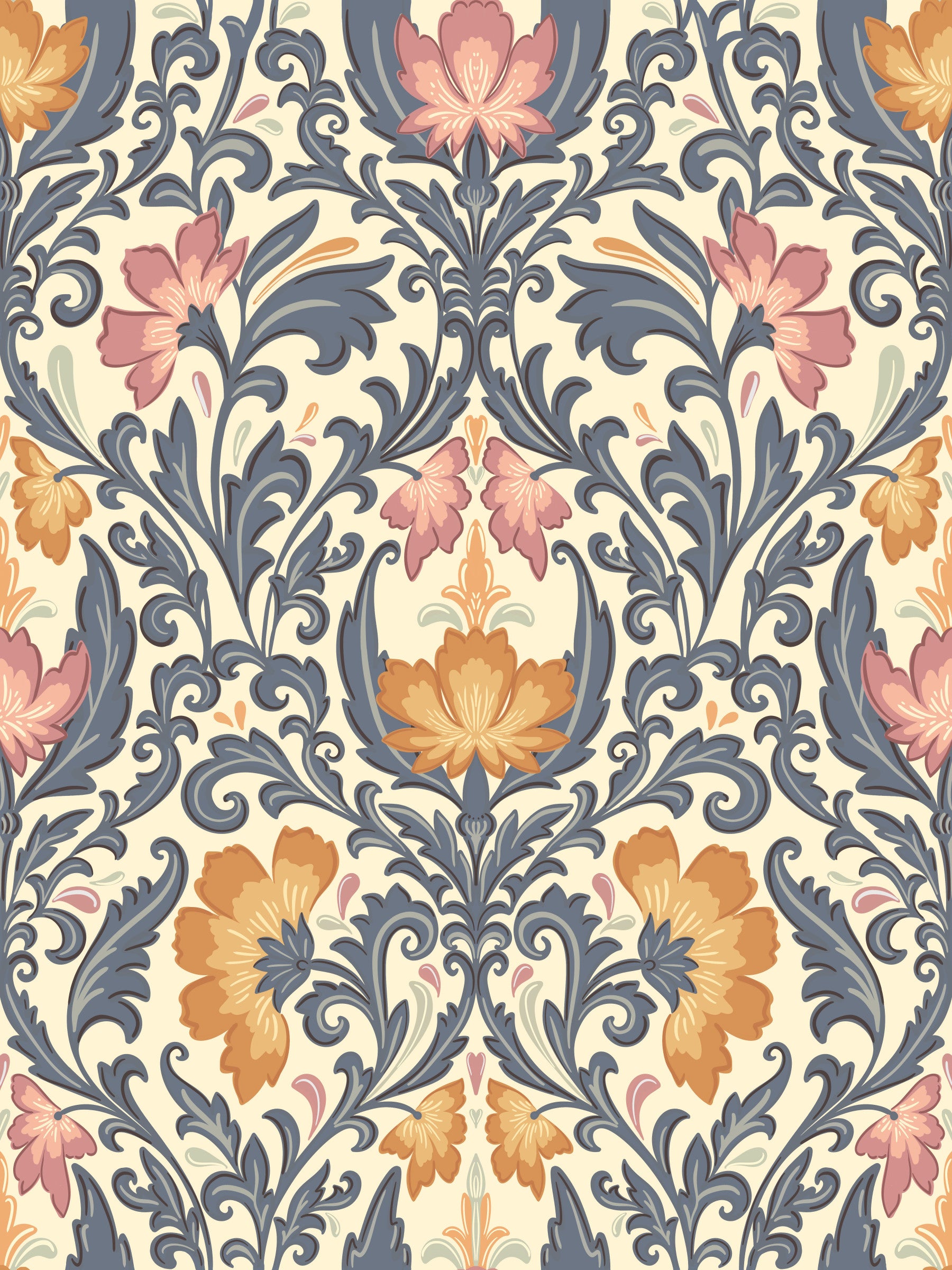 Bloom Damask wallpaper transforms your space with a timeless floral design. The intricate damask pattern showcases stylised blooms and graceful foliage. Warm orange and soft pink flowers pair with cool slate-blue leaves, set against a creamy background. This delightful design enhances various rooms, including living rooms and dining rooms. Bring sophistication and warmth to your walls with wallpaper for walls that will make a statement. Enjoy an interior with charm and beauty with a floral-inspired wallpaper that complements interiors.