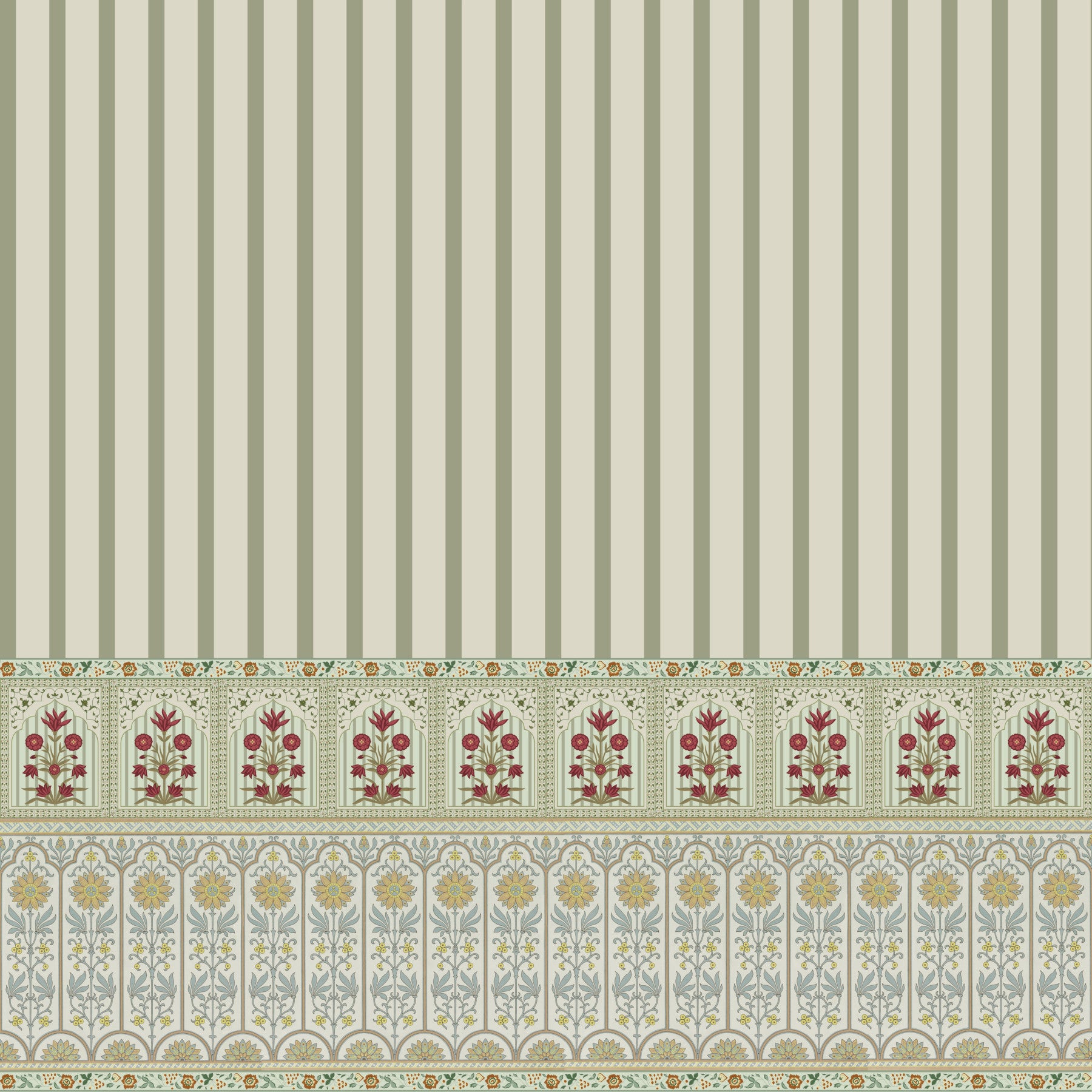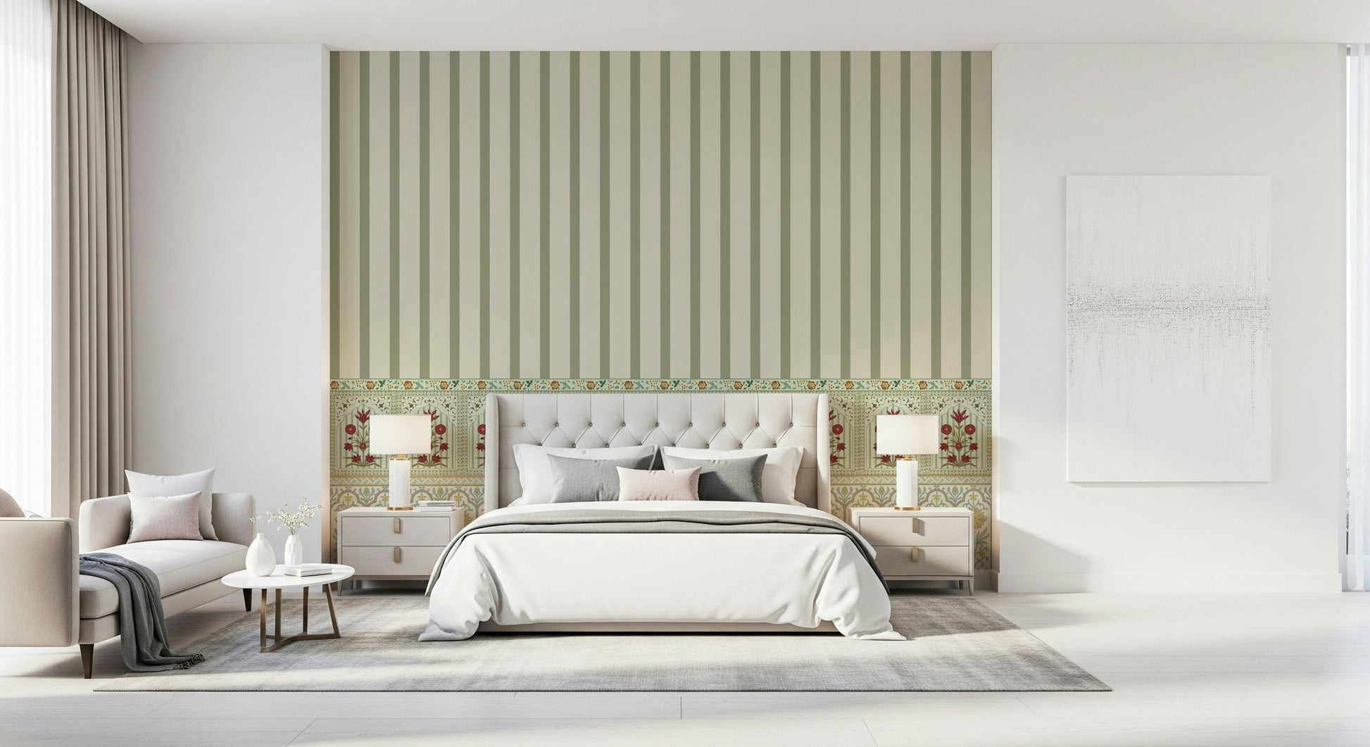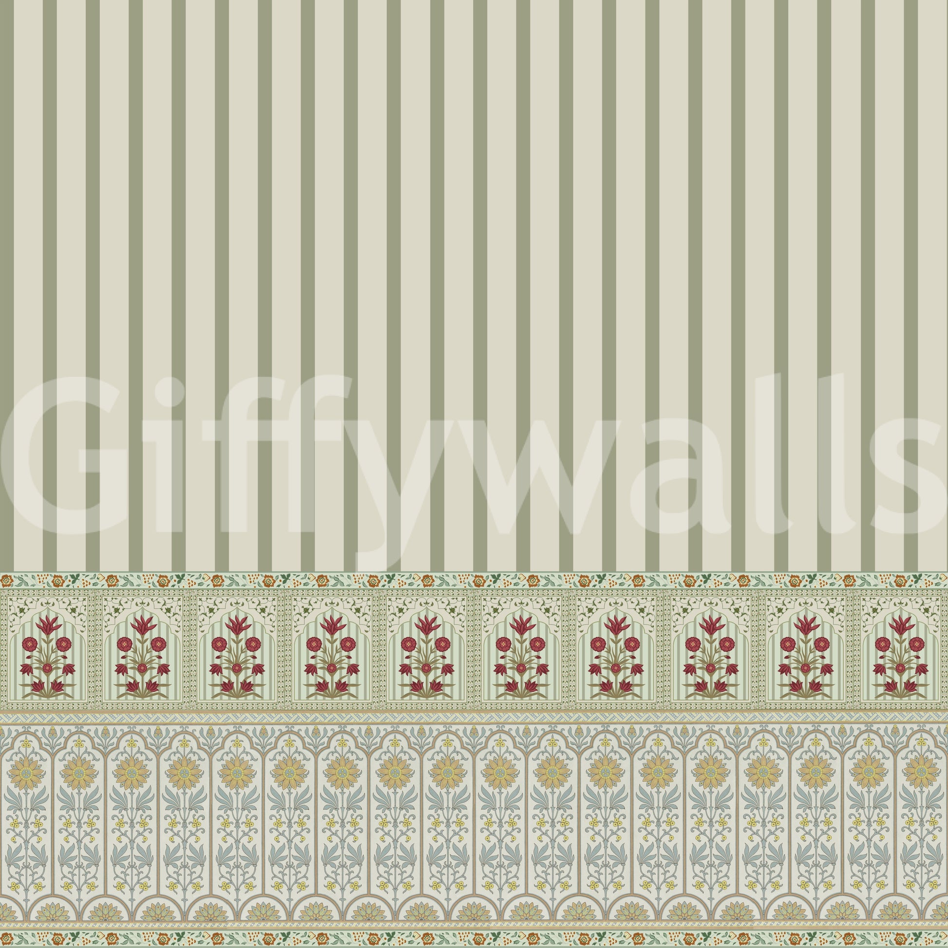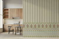 Elevate your living space with this vintage-inspired design. This wallpaper for walls brings together subtle vertical stripes in soothing tones with intricate floral borders. The floral accents feature detailed renderings of blossoming flora, adding a touch of sophistication. The neutral palette provides a serene ambiance, ideal for bedrooms, living rooms, or dining areas. It coordinates smoothly with traditional and contemporary interiors. Enhance your home with this visually appealing design, turning plain walls into captivating centrepieces.