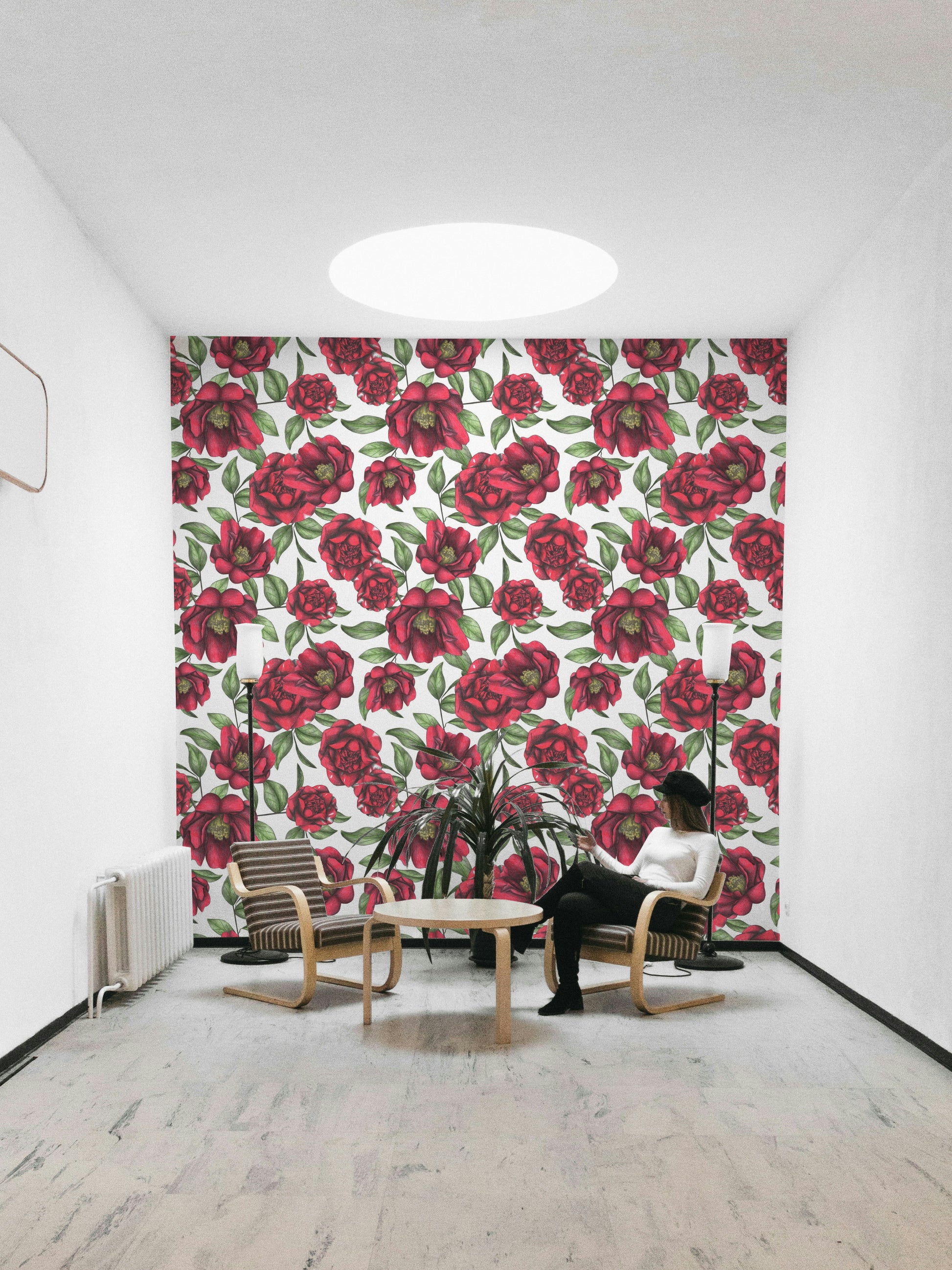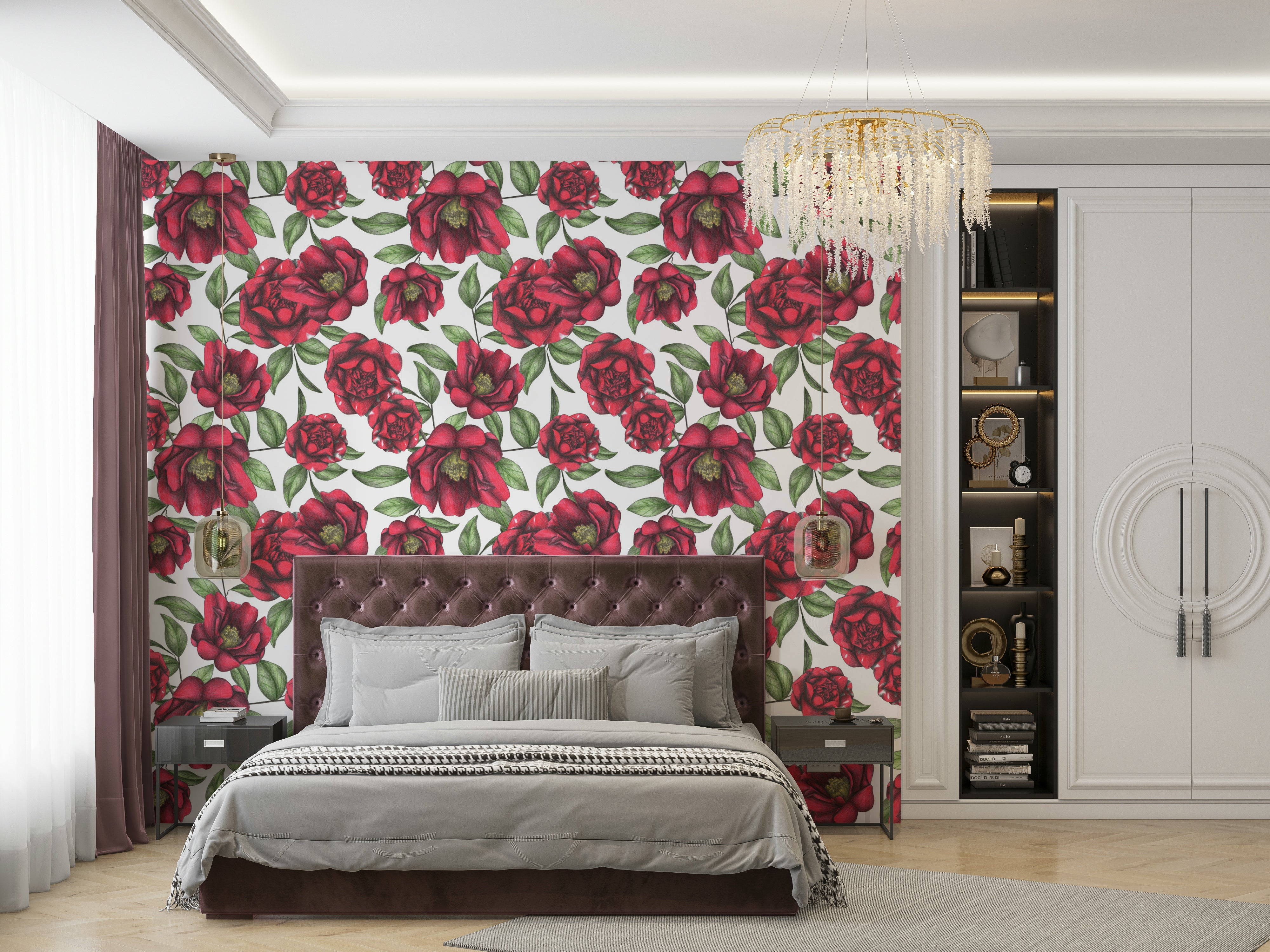 The Blooming Camellias Wallpaper⁠ showcases hand-drawn red camellia flowers with soft green leaves on a light background. This floral wallpaper is a great match for bedrooms, powder rooms, or entryways where a touch of nature fits well. The detailed petals and classic style give the wall depth without being too bold. The repeating camellia pattern offers a clean, vintage look that pairs nicely with wood, brass, or soft furnishings. A strong pick for those looking for wallpaper for walls that adds a floral feel with refined detail and timeless charm.