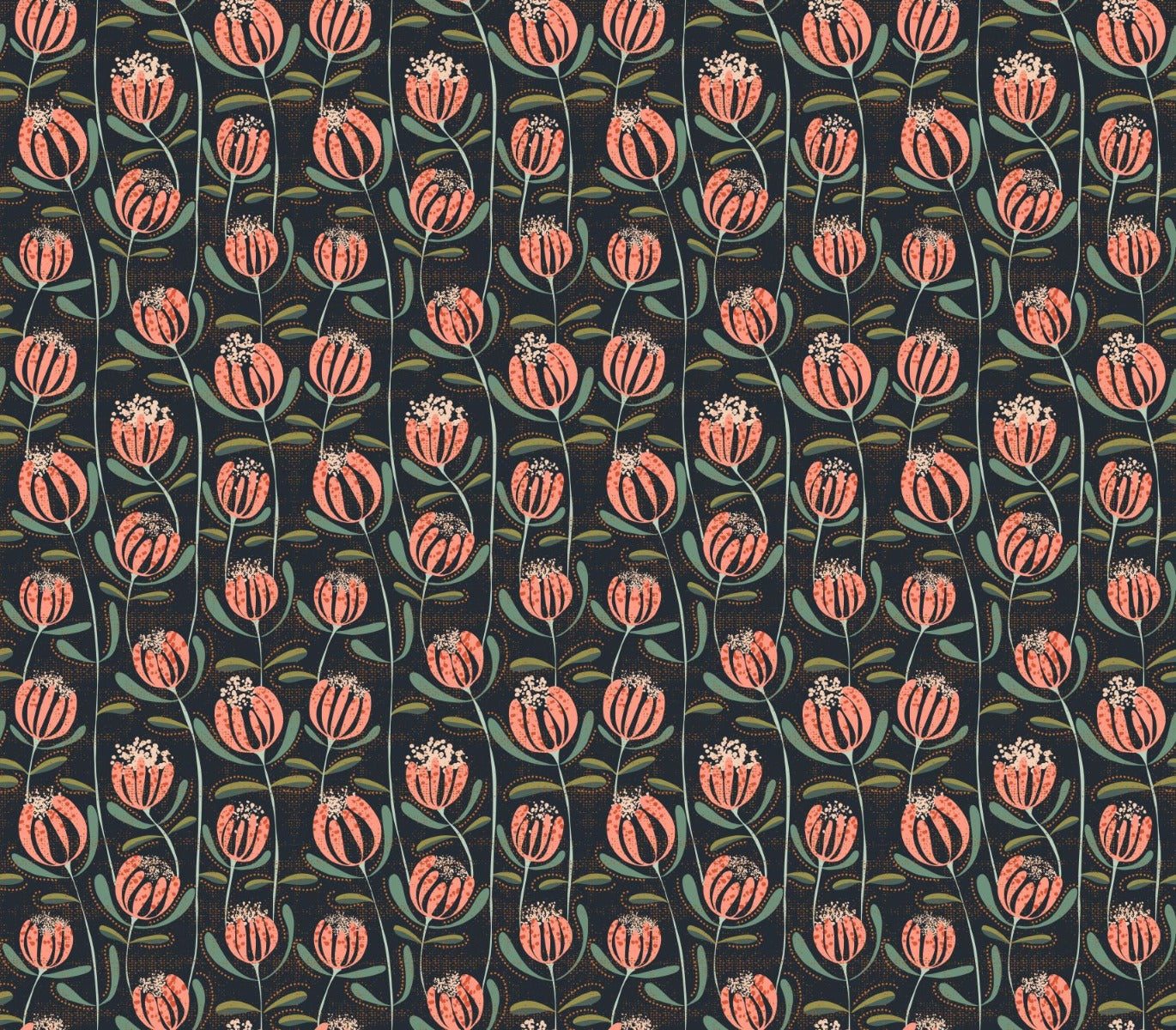 The Blooming Elegance Floral Wallpaper blends a lush array of stylized tulips against a deep backdrop, exuding a Scandinavian wallpaper charm. Each bud and petal, outlined with delicate dots, captures a modern yet timeless aesthetic, perfect for adding a dash of botanical artistry to any room. The meticulous pattern repeat creates a seamless flow across walls, while the rich color palette invites depth and a hint of mystery to your interiors. Ideal for creating a focal point or covering an entire area, this wallpaper fuses nature-inspired motifs with Nordic simplicity, crafting a serene yet striking visual narrative. Embrace a touch of nature's poetry with this Scandinavian-inspired design that promises to gently complement your living environment.