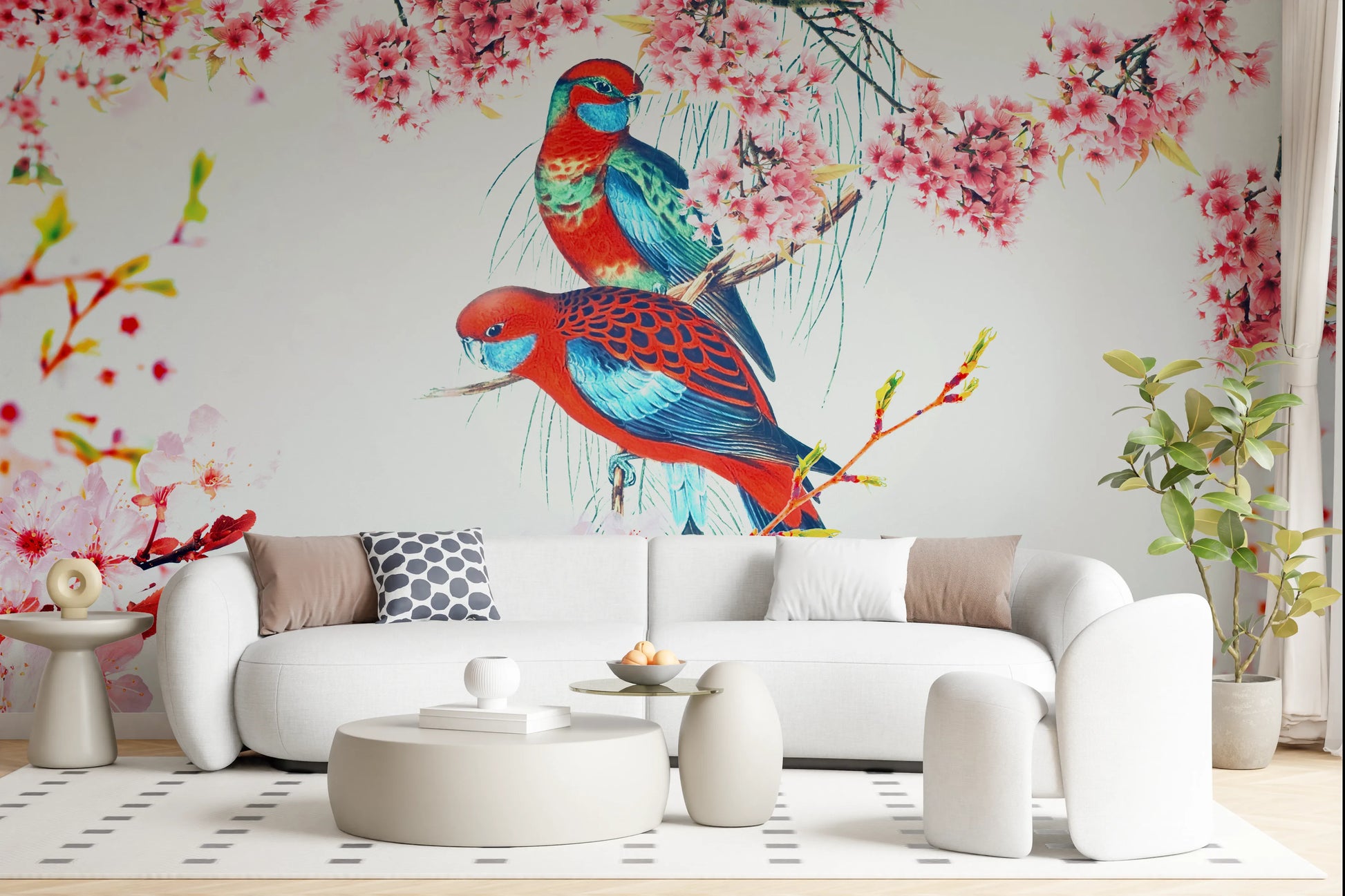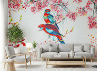 Invite spring indoors with this elegant wallpaper for walls. Graceful birds perch among blooming branches, creating a serene and sophisticated ambiance. The red and blue birds stand out against a soft pink floral background. This design works wonderfully in living rooms, bedrooms, or dining rooms, adding a touch of nature and refined style. The delicate blossoms and vibrant birds make a striking statement, bringing freshness and character to any interior. Transform your space with this beautiful and calming design. It enhances interiors and complements décor.