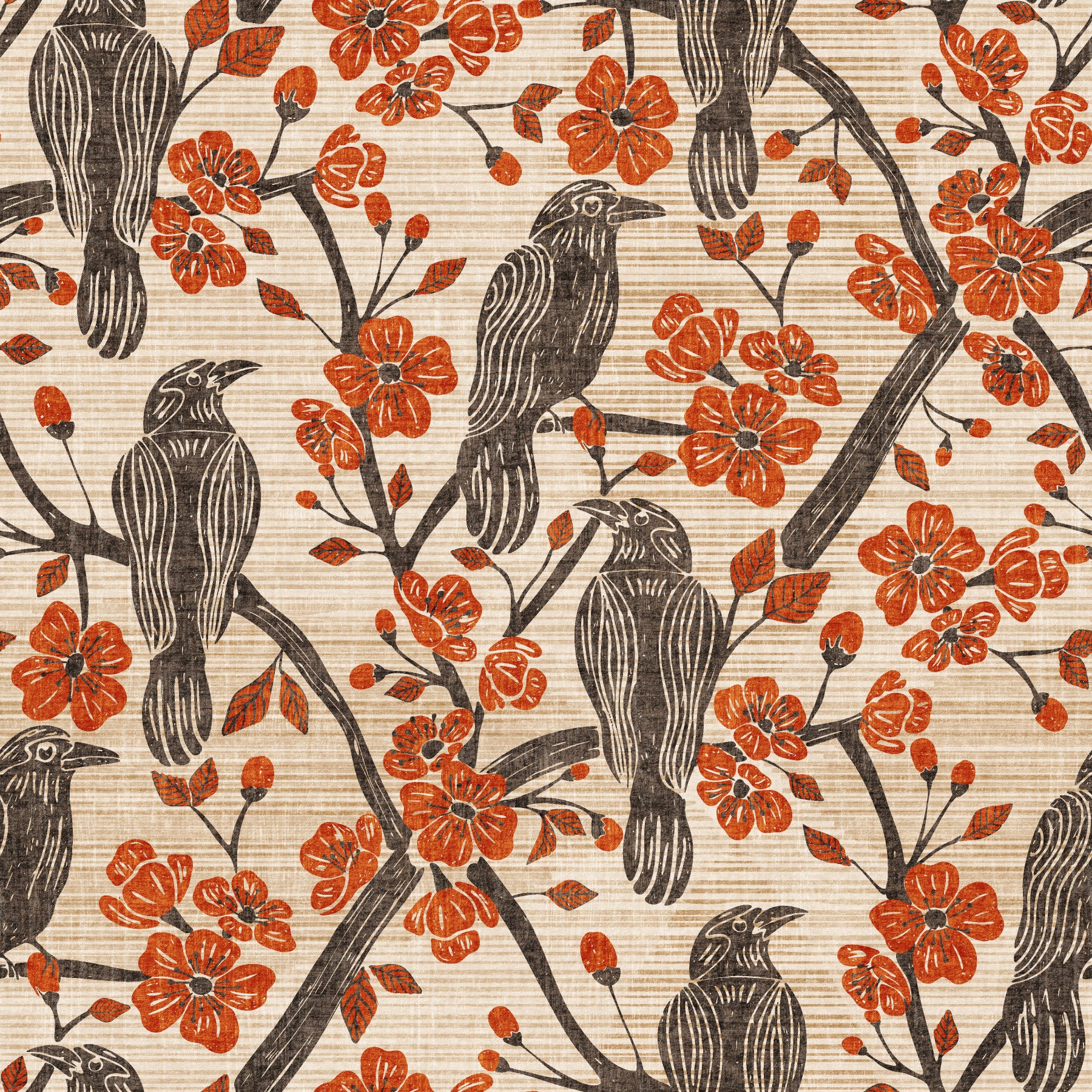 Infuse a touch of natural serenity into your interiors with this decorative pattern featuring ravens among vibrant blossoms. See detailed petals stand out against a rustic textured finish. The earthy orange hues bring warmth to any space. Adorn your home with wallpaper for walls that delivers both style and ambiance. Visualize this motif gracing a bathroom or entryway. Its unique blend of classic and contemporary design complements various interior styles, lending character and charm.