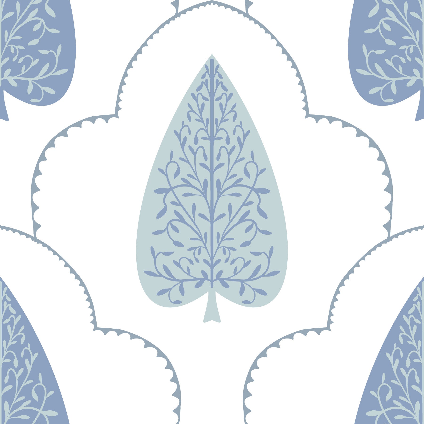 Scalloped Blue Botanic Arbor mural, repeating geometric frame.