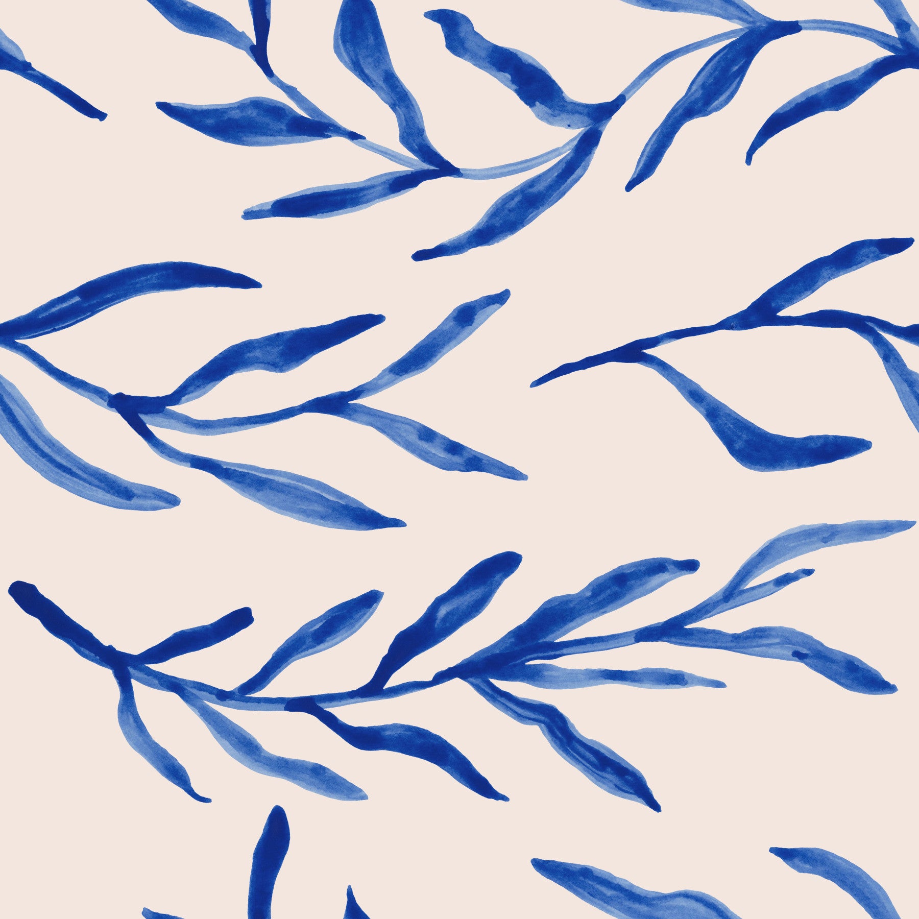 Stylized blue leaf and floral pattern creating a serene wall backdrop.