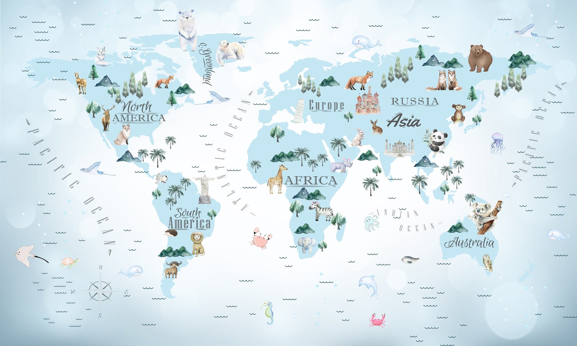 Blue Kids Room World Map Wallpaper Murals - Giffywalls