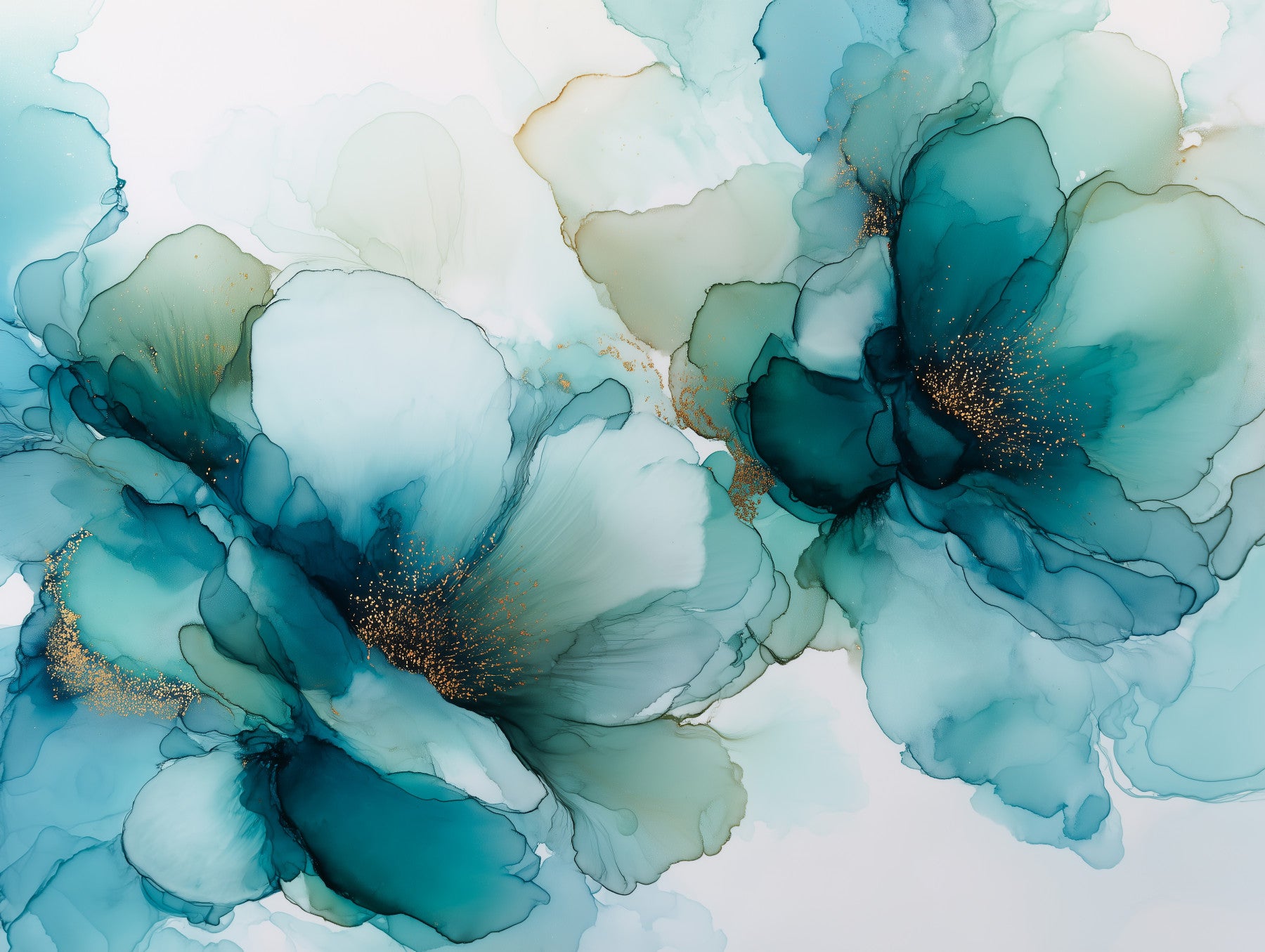 Enhance your living space with Blue Mist Ink Flowers wallpaper. The design features flowing, abstract floral patterns with teal and aqua tones, enhanced with shimmering gold accents. The artistic touch gives a luxurious effect. This wallpaper for walls brings an element of nature into your home. Perfect for a sophisticated bedroom, a serene bathroom, or an inviting entryway. The unique design seamlessly blends with various interior styles.