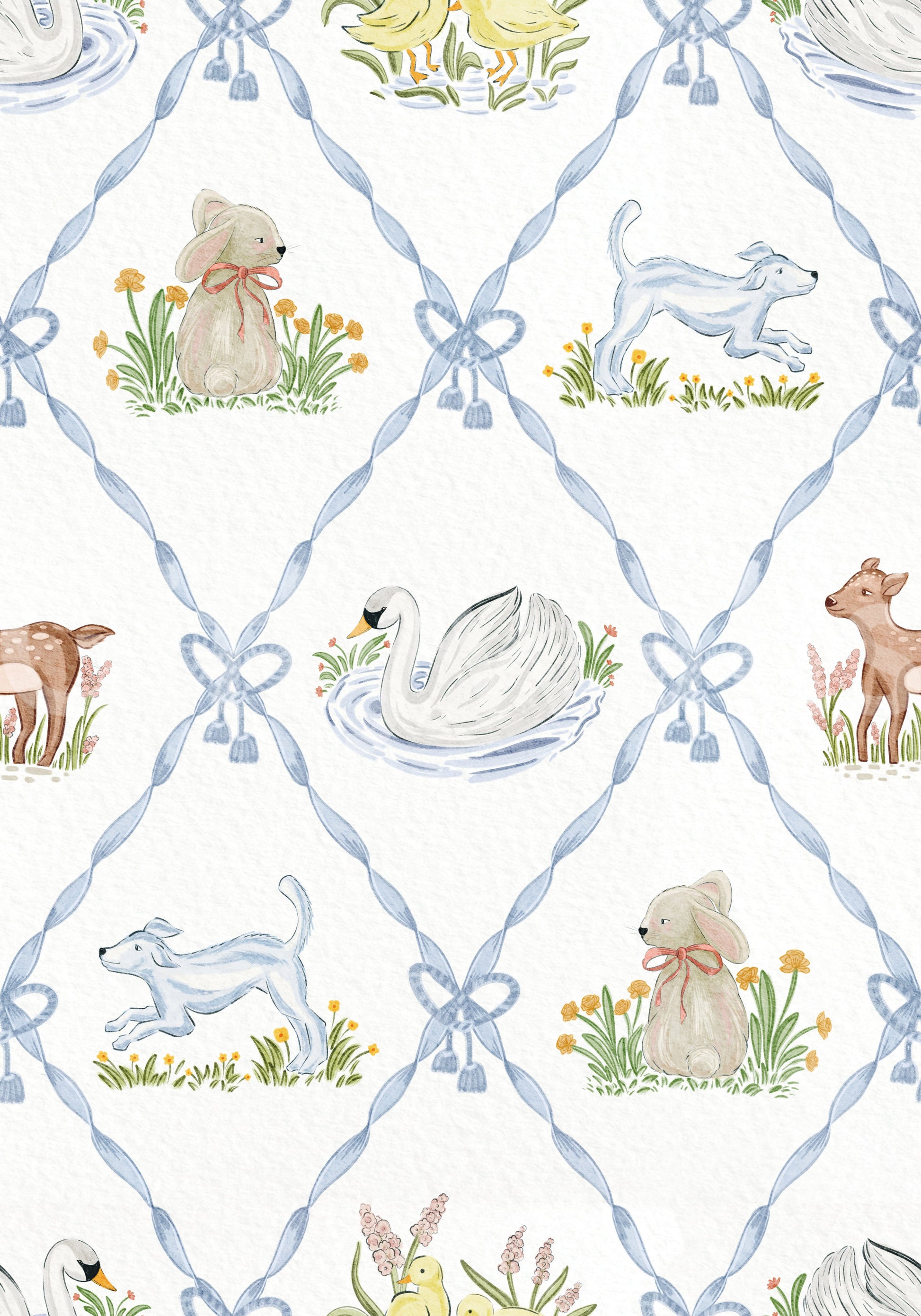 This wallpaper design presents a delightful watercolor scene of charming animals peacefully coexisting in a vibrant meadow. The soft pastel color palette, featuring calming blues and gentle greens, creates a serene atmosphere. The repeating pattern of blue ribbons adds an elegant touch, while the hand-drawn illustrations of bunnies, dogs, deer, and swans evoke a sense of gentle playfulness. Perfect for a nursery, bedroom, or playroom, this wallpaper will bring a touch of whimsy and tranquility to your space, creating a soothing and happy environment.