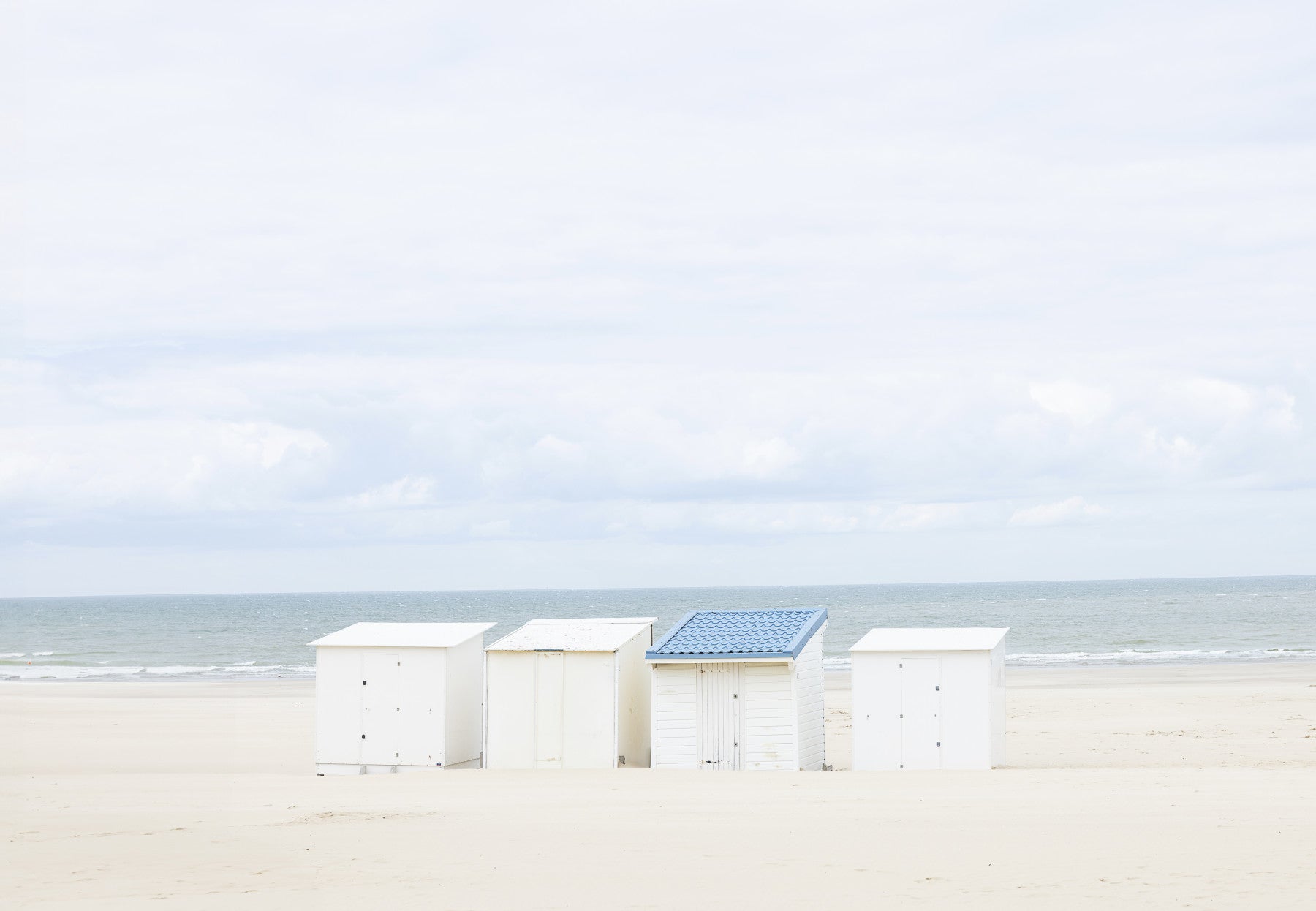 A minimalist beach scene featuring four pristine white beach huts, set against a tranquil expanse of ocean and a soft, pale sky. The subtle pop of a vibrant blue roof on one hut provides a captivating focal point, drawing the eye and creating a serene yet striking contrast. This wallpaper evokes a calming mood, perfect for those seeking a peaceful escape, capturing the essence of seaside tranquility and simple beauty. The clean lines and muted color palette create a soothing atmosphere, ideal for desktop or mobile backgrounds.
