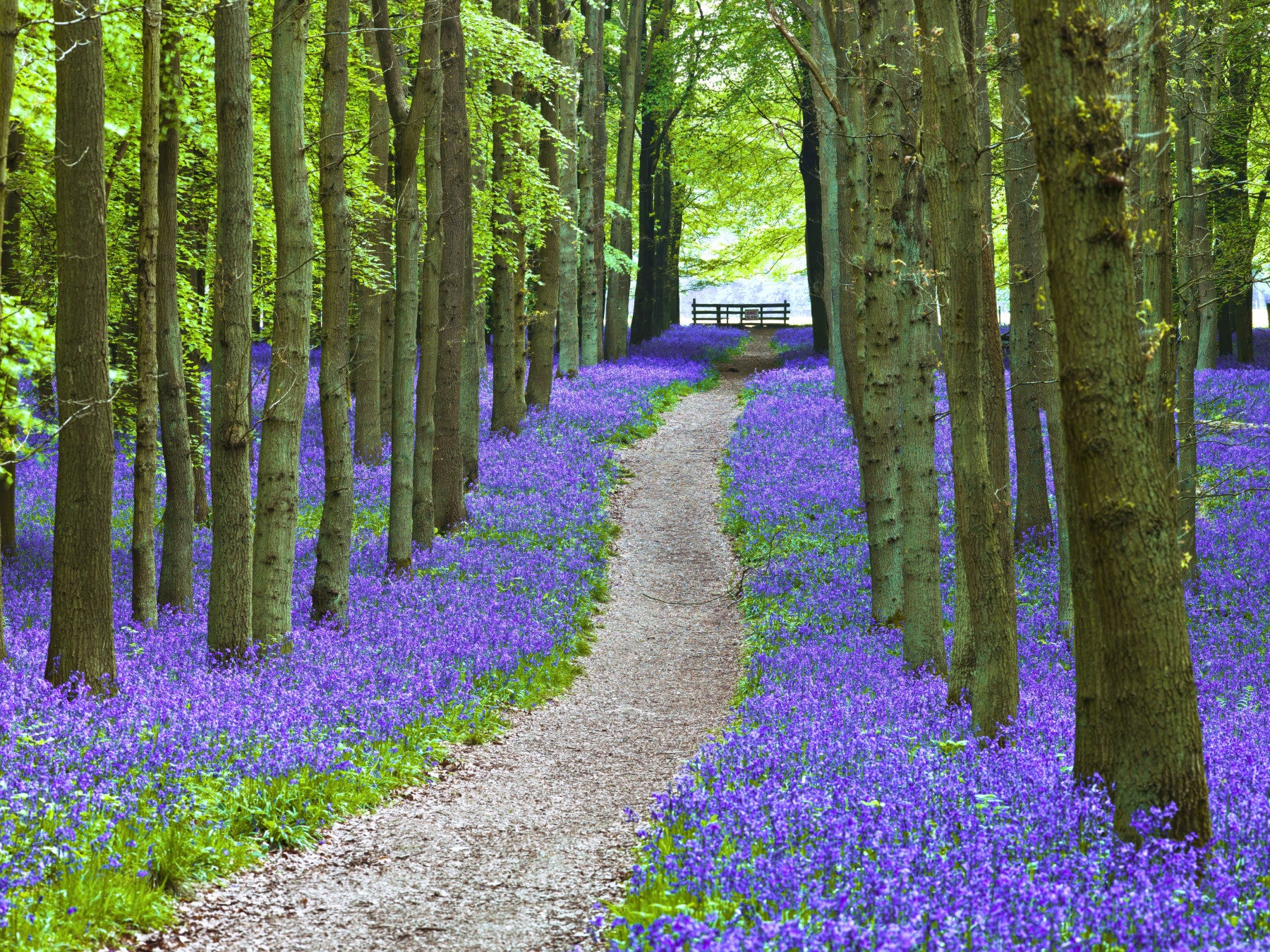 Nature wallpaper with tall forest trees and a carpet of purple-blue bluebells along a peaceful path.