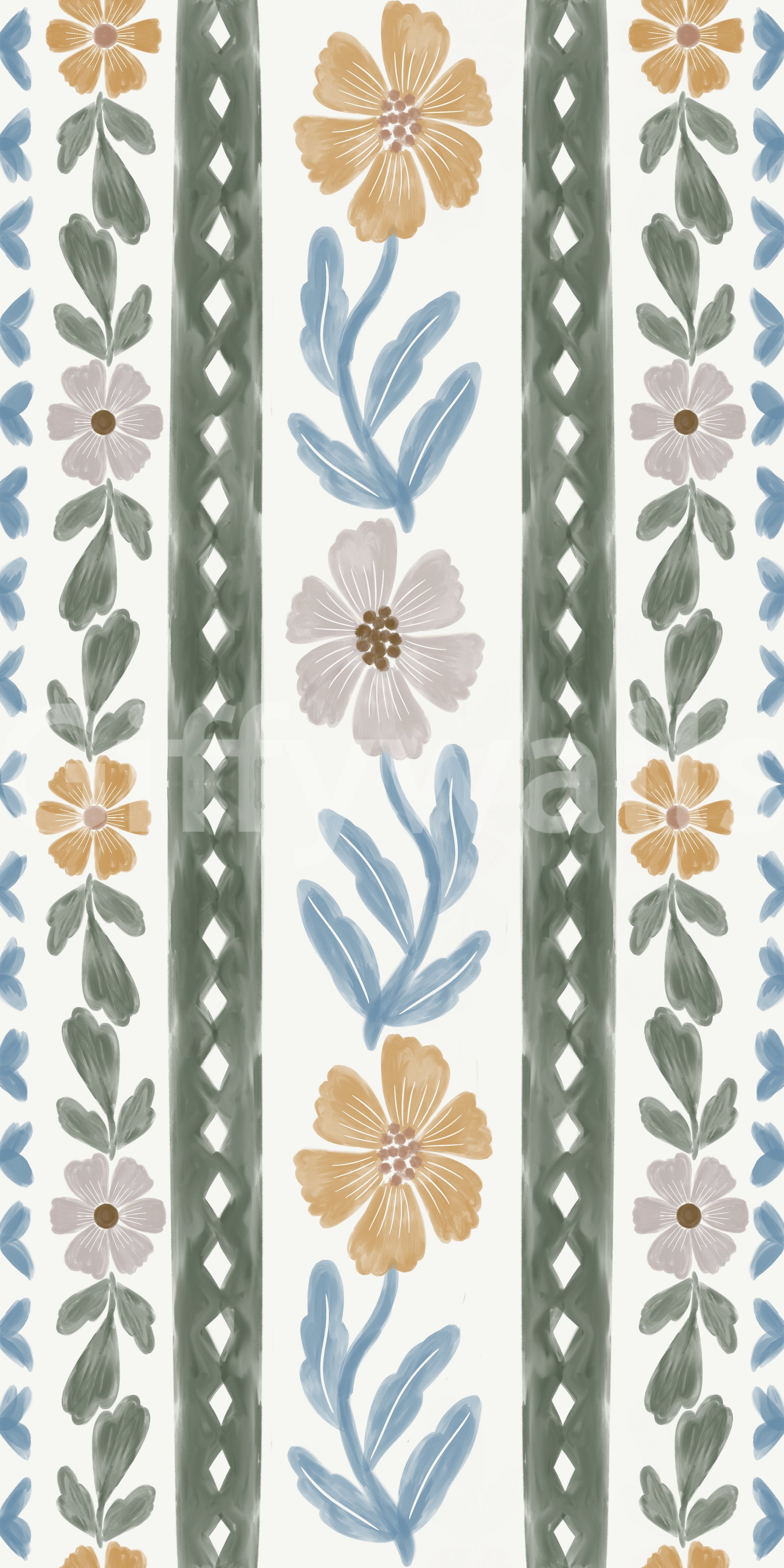 This wallpaper showcases a delicate and charming arrangement of blush pink and dusty blue flowers and leaves arranged in vertical stripes. The hand-painted watercolor style gives it a soft, romantic feel. The color palette is exceptionally calming and understated, making it perfect for a bedroom or nursery. The repeating pattern adds a sense of gentle rhythm and visual interest, creating a relaxing and aesthetically pleasing atmosphere. Its simplicity and elegance make it a versatile option for a variety of interior styles.