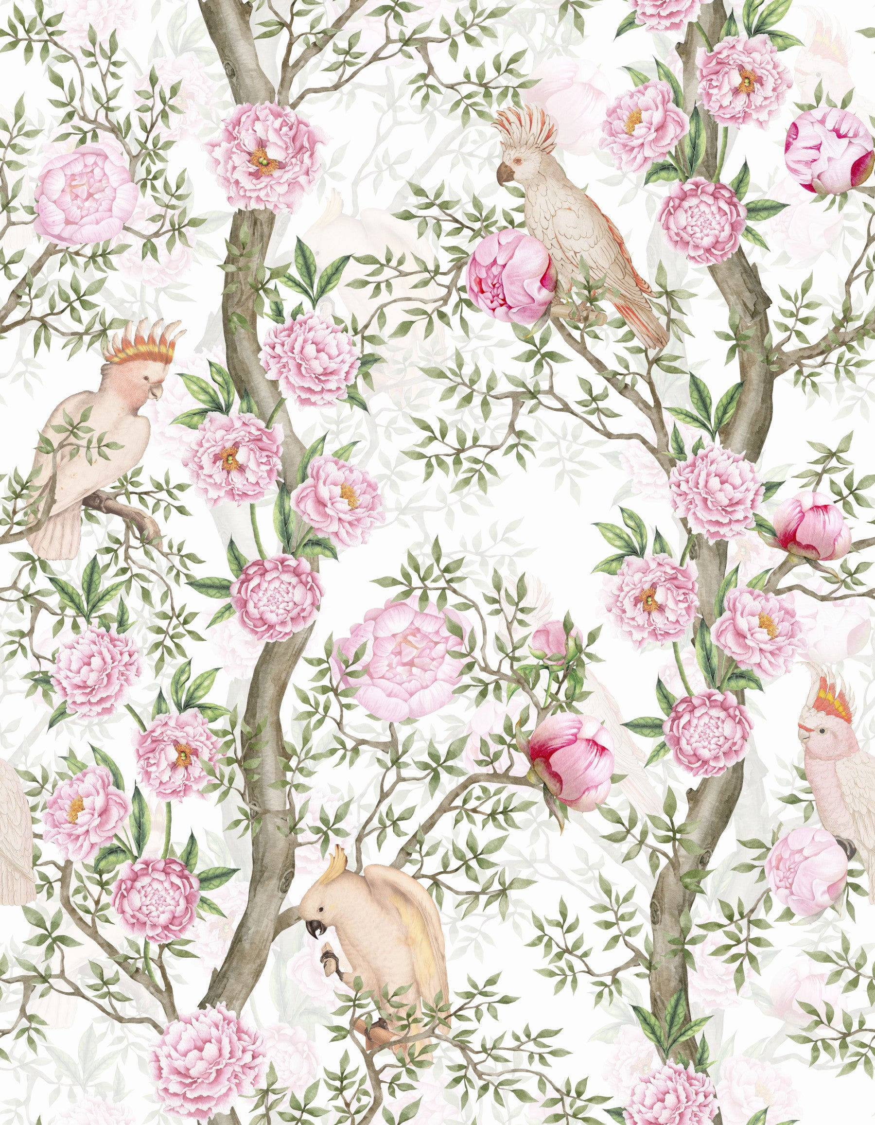 Immerse yourself in a dreamy world of blush pink peonies and graceful cockatoos with this enchanting wallpaper. Delicate watercolor brushstrokes capture the soft beauty of the flowers, while the lifelike portrayal of the birds adds a touch of whimsy. The seamless pattern creates a tranquil and elegant atmosphere, perfect for bedrooms, living rooms, or any space where serenity is desired. The light and airy feel of the design brings a touch of sophistication and natural beauty to your home décor.