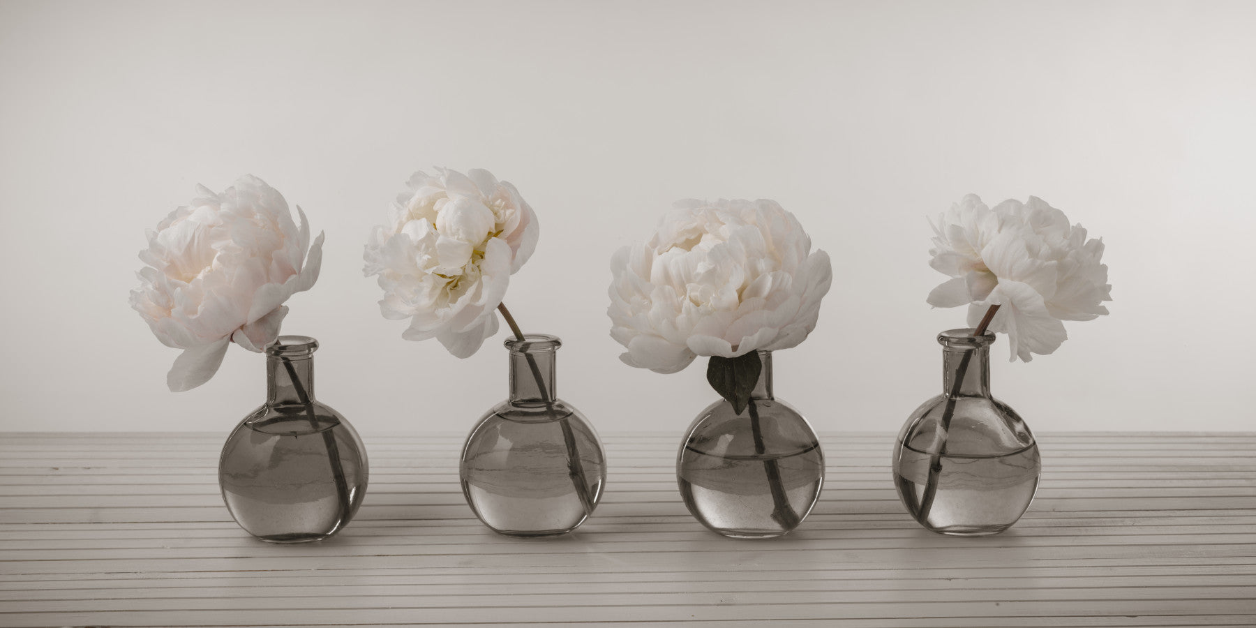 A high-resolution photo-realistic wall mural of a row of four peonies in glass vases.