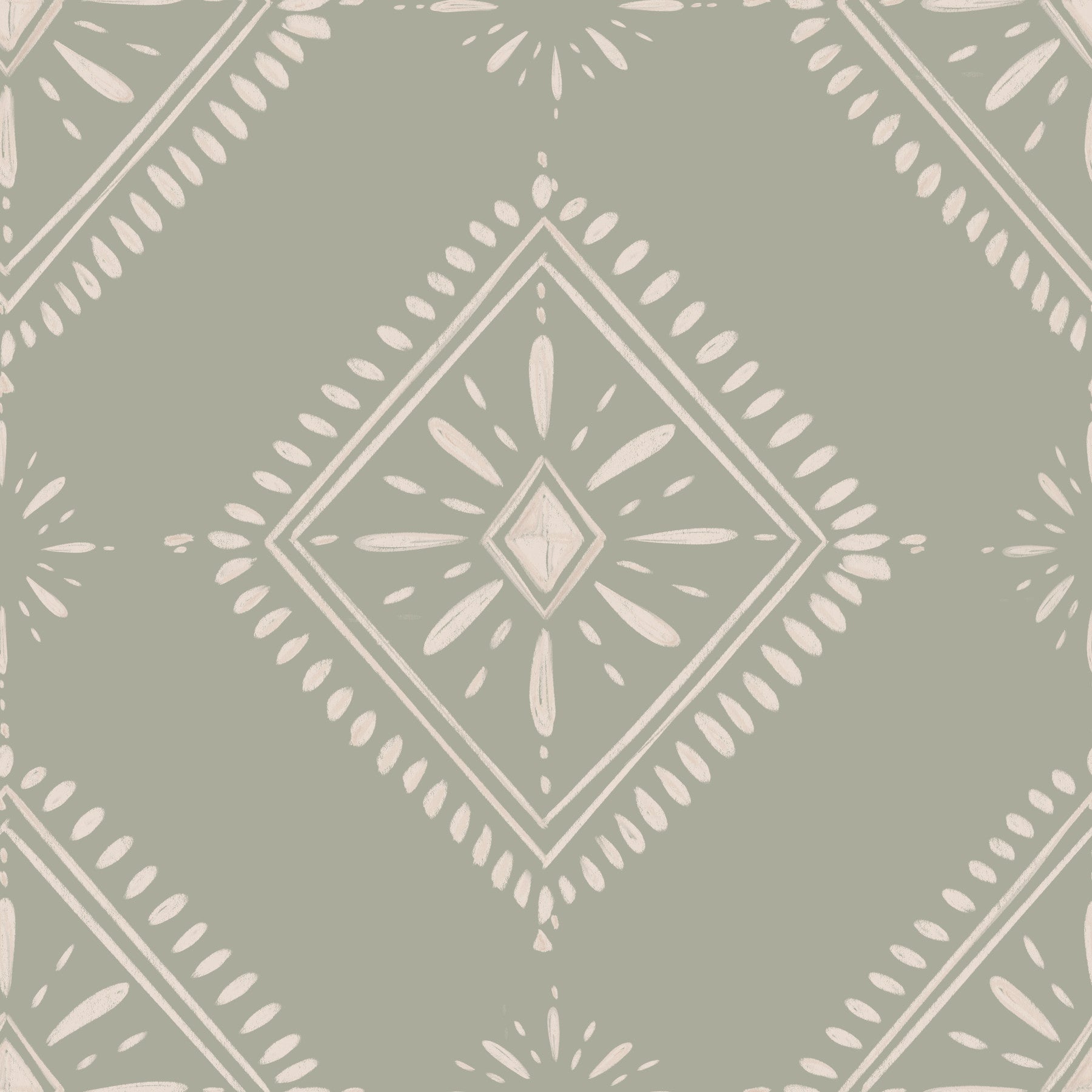 Bohemian Diamonds captures the essence of understated elegance with its calming sage green base and delicate off-white, hand-drawn floral patterns. The design evokes the quiet beauty of a desert landscape, where subtle details create a captivating whole. The geometric shapes, with their organic feel, suggest a sense of quiet growth and resilience. This versatile wallpaper is perfect for adding a touch of understated luxury to any room, from bedrooms and living rooms to hallways and entryways. Its muted color palette and subtle pattern work beautifully in a variety of interior design styles.