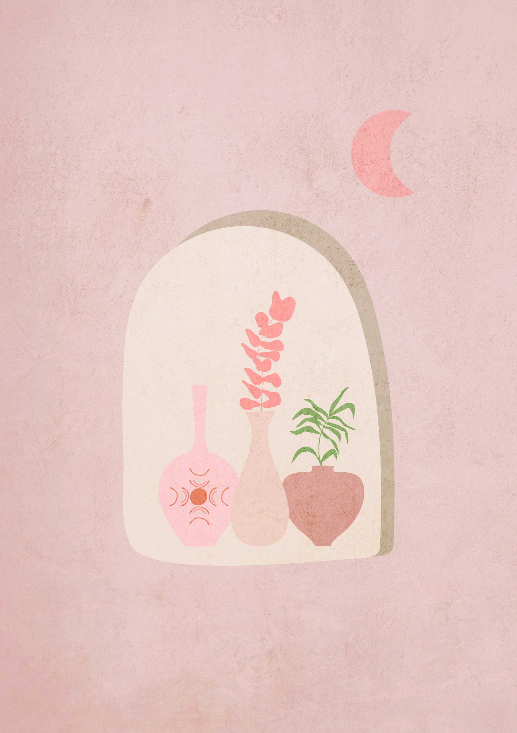 Bring a touch of bohemian charm to your space with this captivating wallpaper. The soft, earthy tones of blush pink, beige, and terracotta create a calming atmosphere, reminiscent of a sun-drenched desert oasis. The stylized illustration of plants and vessels adds a touch of modern artistry, while the crescent moon introduces a mystical element. Ideal for living rooms, bedrooms, or any space needing a dose of serene sophistication. This design effortlessly blends modern and traditional influences to create a stunning statement wall.