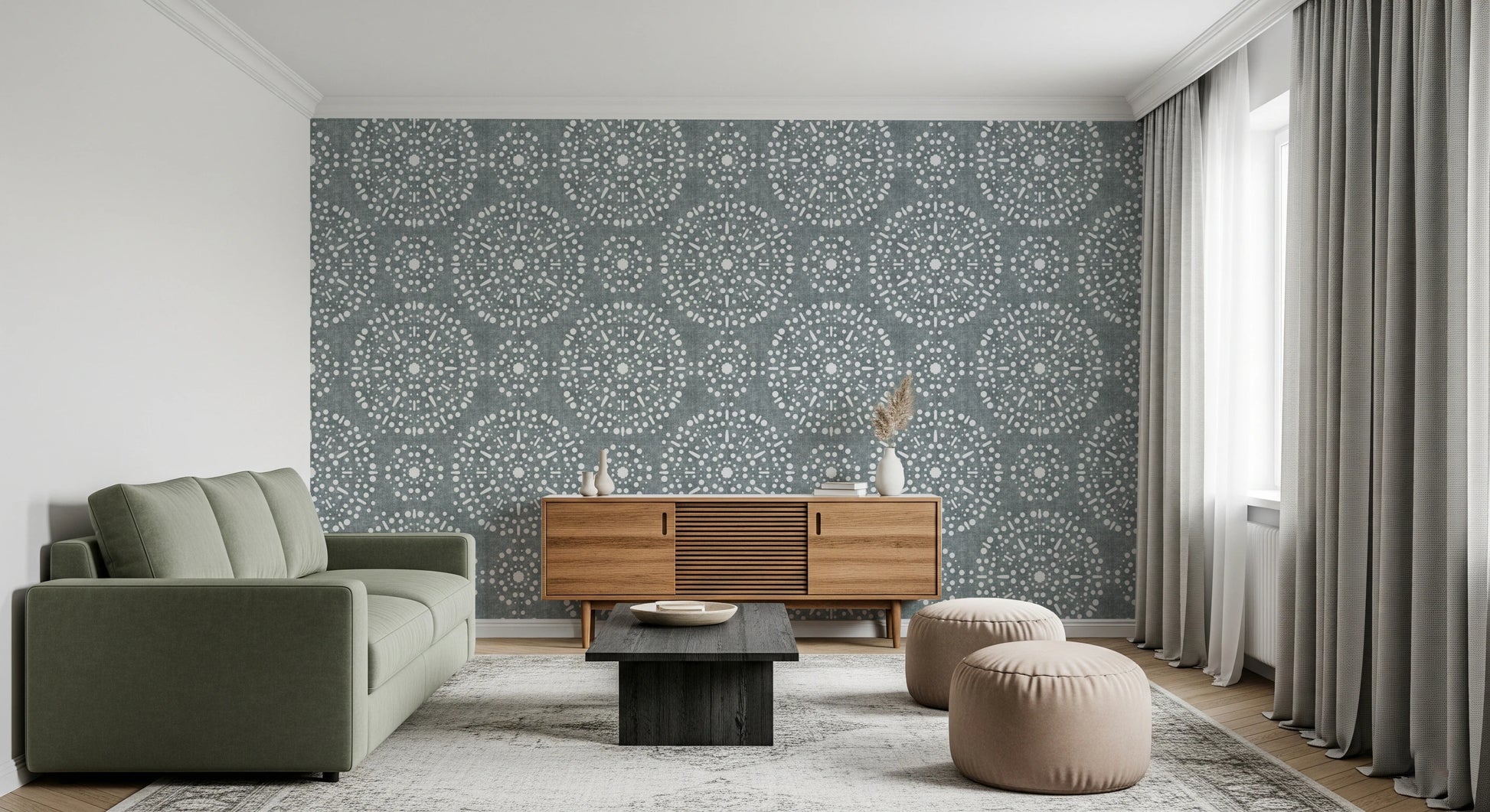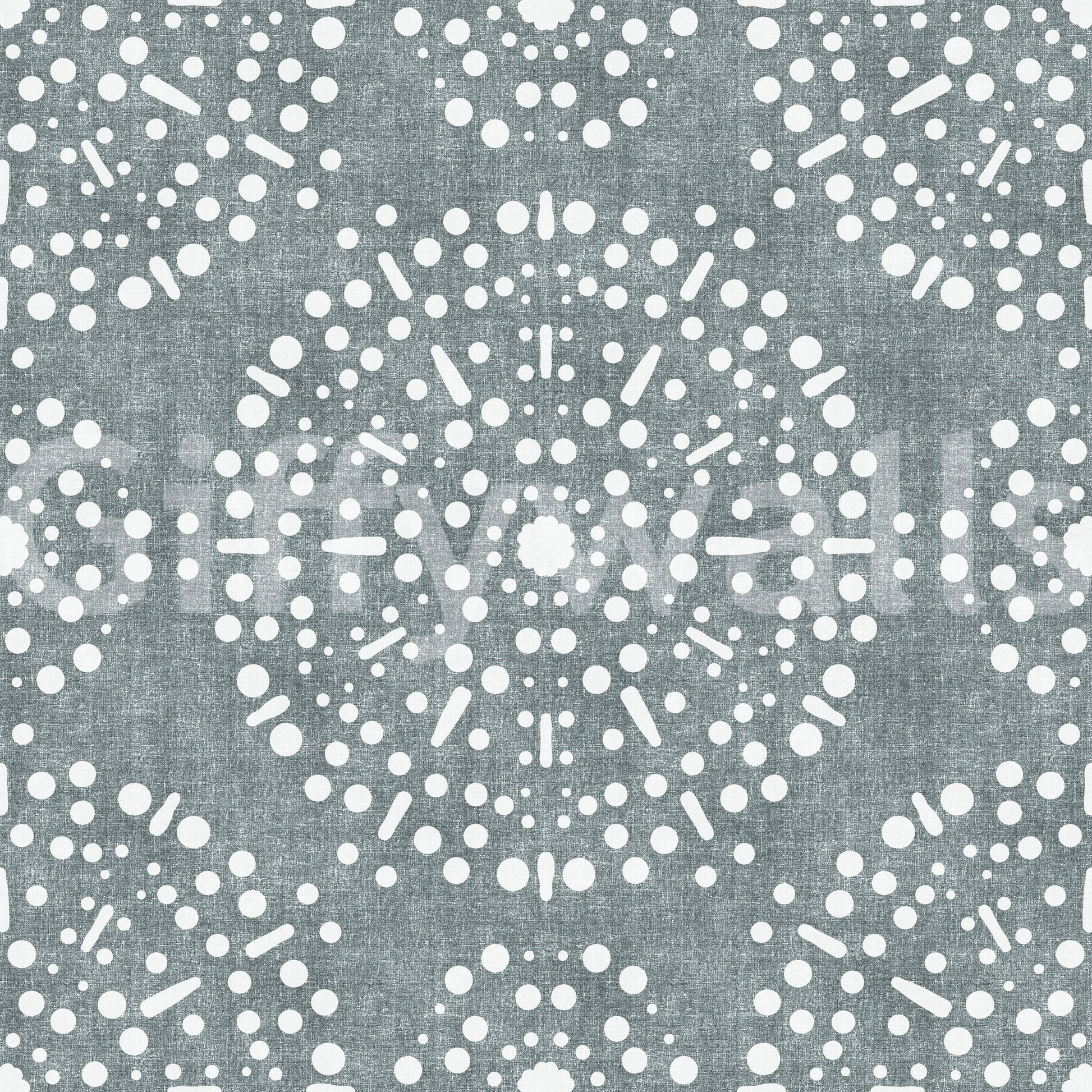 Evoke a sense of serene celebration with this captivating wall covering. "Boho Fireworks Grunge Calming Blue" artfully blends the relaxed essence of bohemian style with a touch of festive whimsy. The calming blue backdrop, reminiscent of twilight skies, is overlaid with an intricate pattern of white circles and dashes suggestive of stylised fireworks. A subtle grunge texture adds depth and character, giving the design a lived-in, vintage feel. Perfect for creating a tranquil yet subtly dynamic atmosphere, this design infuses spaces with a unique blend of comfort and understated elegance. It is perfectly placed in any room to bring a relaxing and creative environment.