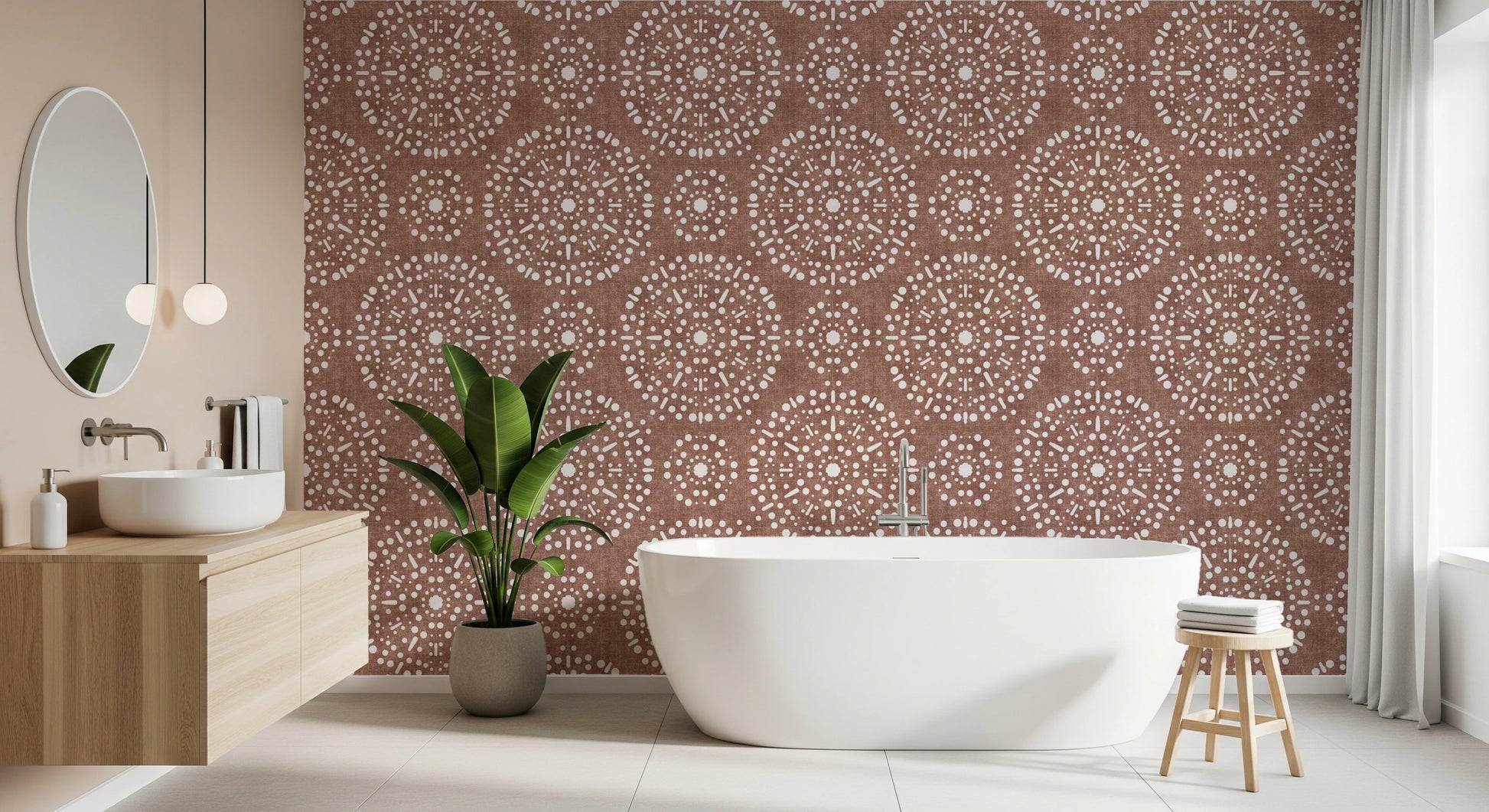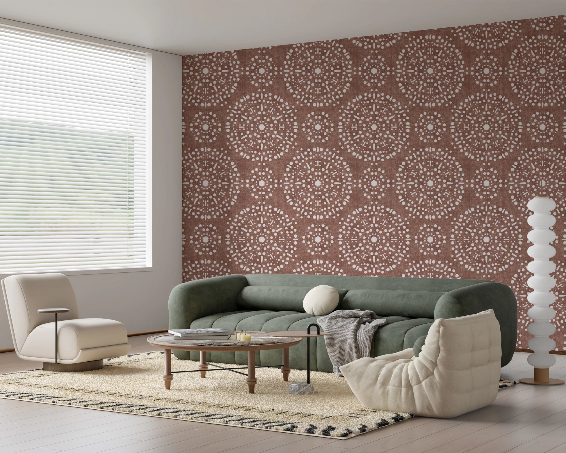 Embrace the warmth of "Boho Fireworks Grunge Terracotta Red" and infuse your space with rustic charm and an unexpected burst of celebratory energy. This wall décor features a captivating interplay of circular motifs and linear accents reminiscent of fireworks frozen in time. Against a distressed terracotta backdrop, the off-white pattern brings a sense of bohemian artistry. This design marries free-spirited style with a touch of urban edge. Perfect for creating a cosy, inviting atmosphere with a hint of playful rebellion, it is ideal for those seeking a distinctive and visually intriguing wall treatment.