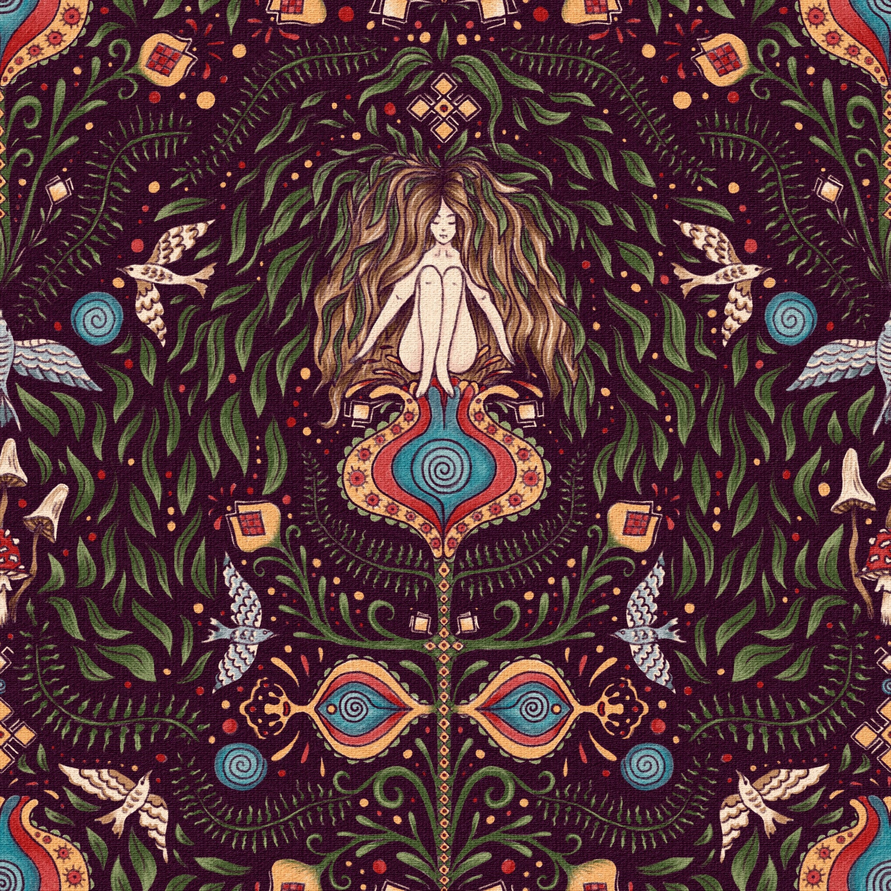 Evoke a bohemian vibe with this hand-drawn forest dream. The wallpaper features a mesmerizing arrangement of leaves, birds, and a central figure. Warm yellows and muted blues pop against a deep eggplant background. This unique print transforms any living space into a calming retreat. Consider this wallpaper for walls for a captivating feature in your living room, dining room, or study. Its intricate details bring a soulful touch to modern and rustic interiors.