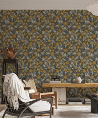 Boho Maximalist Flowers Golden and Gray Wallpaper