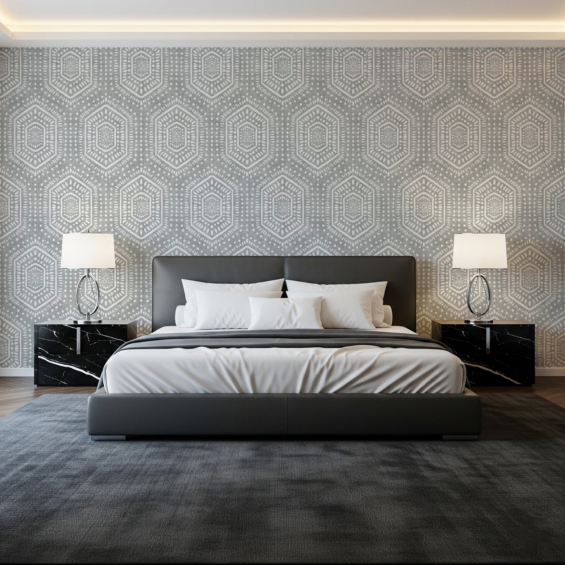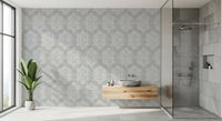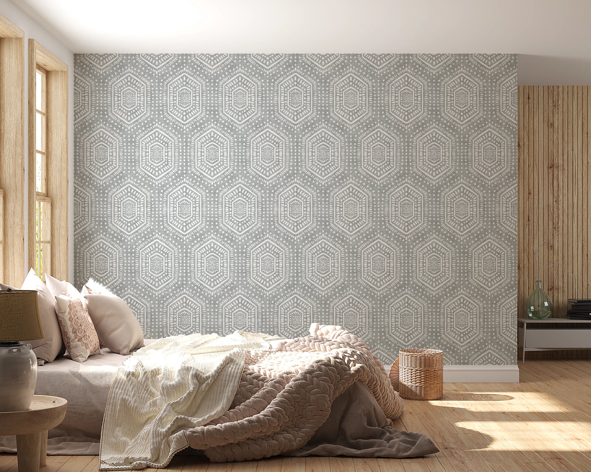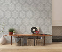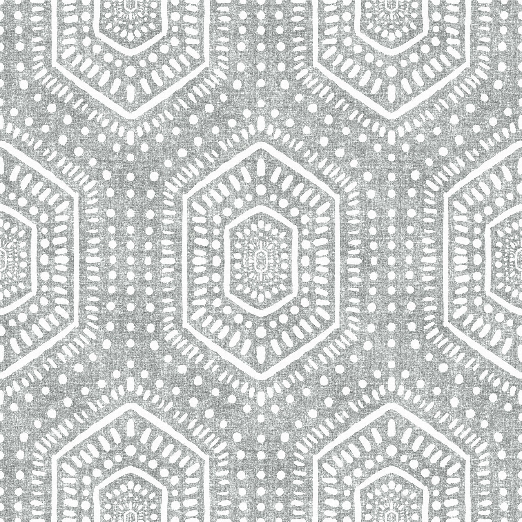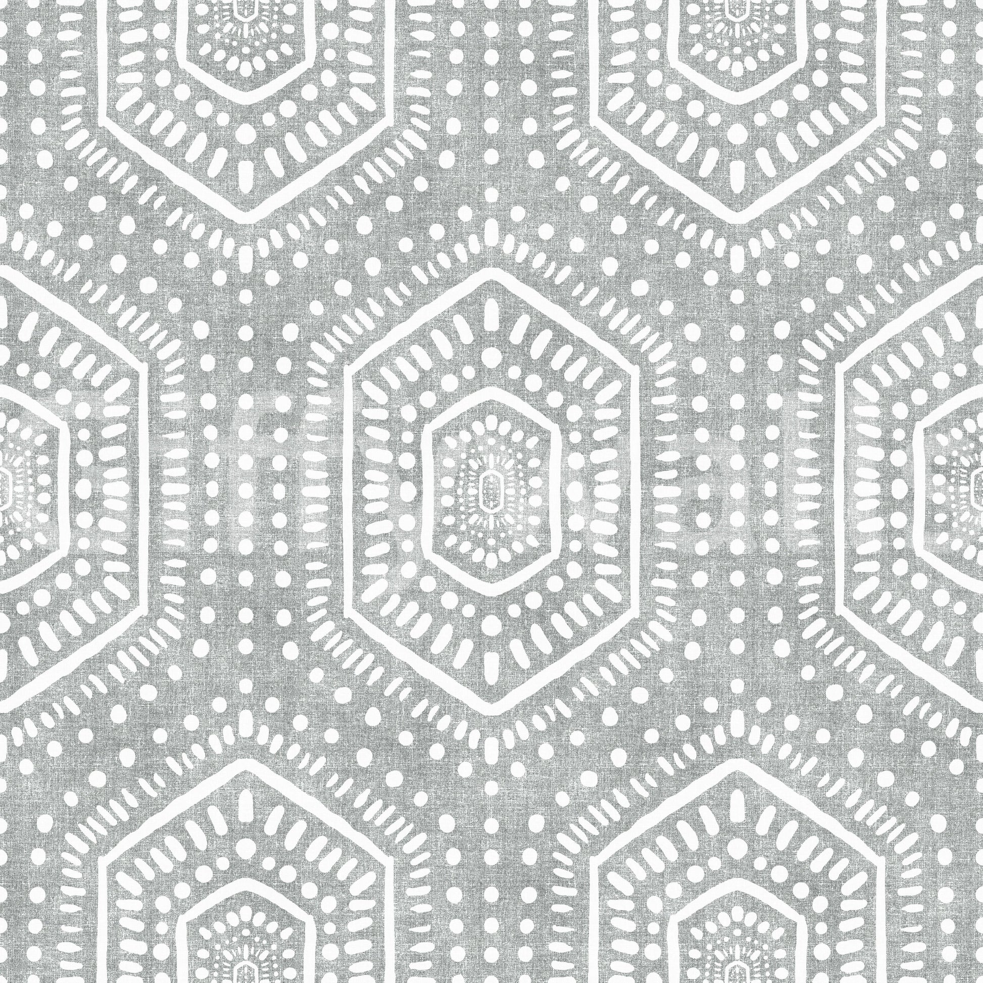 Embrace the tranquil allure of the 'Boho Painted Grunge Grey Clouds,' a wall covering that evokes a sense of calm and artistic freedom. The subtle grey backdrop, reminiscent of a cloudy sky, provides a textured canvas for a free-spirited pattern. Bold, hand-painted geometric shapes, outlined in clean white, create a striking contrast, adding a touch of bohemian charm. The grunge effect lends a lived-in, vintage feel, perfectly capturing a relaxed yet stylish ambiance. Perfect for creating a serene and sophisticated focal point in any room, this design brings a unique blend of rustic texture and modern geometric elegance to your walls. The off-white, hand-drawn pattern is reminiscent of vintage textiles, adding depth and character to your space.