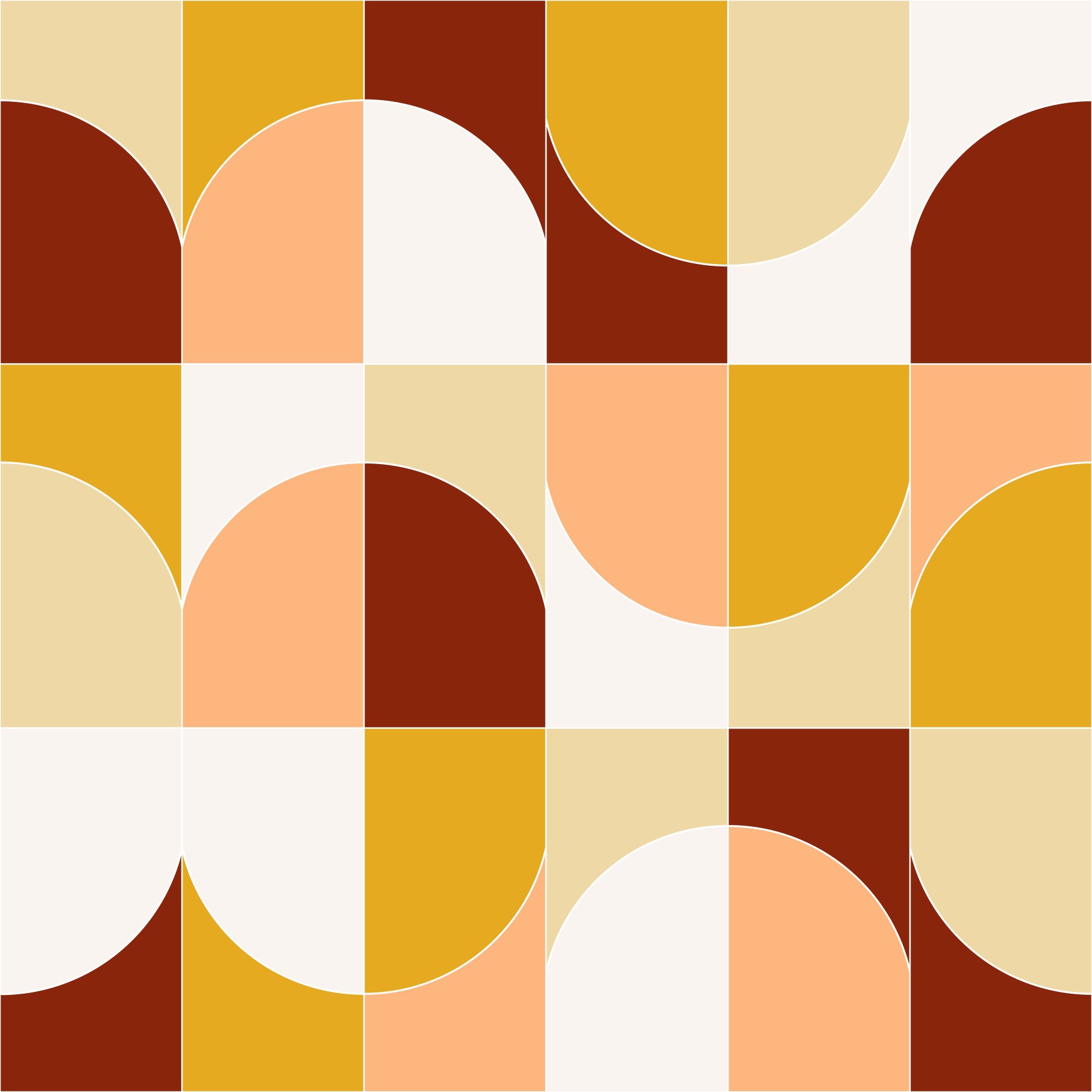 Unleash a retro-modern vibe with BOLD GEO TILES 03 a captivating geometric wallpaper that commands attention. This design features a dynamic grid of semi-circular shapes, juxtaposed against solid squares, creating a visually striking and balanced composition. The color palette, a harmonious blend of warm earth tones including burnt sienna, mustard yellow, and soft peach, infuses your space with a sense of warmth and sophistication. Clean white lines accentuate the shapes, adding a touch of contemporary elegance to this timeless pattern. Perfect for adding a bold statement to any room, "BOLD GEO TILES 03" evokes a feeling of confidence and style, ideal for those seeking a unique and expressive aesthetic that is both eye-catching and calming.
