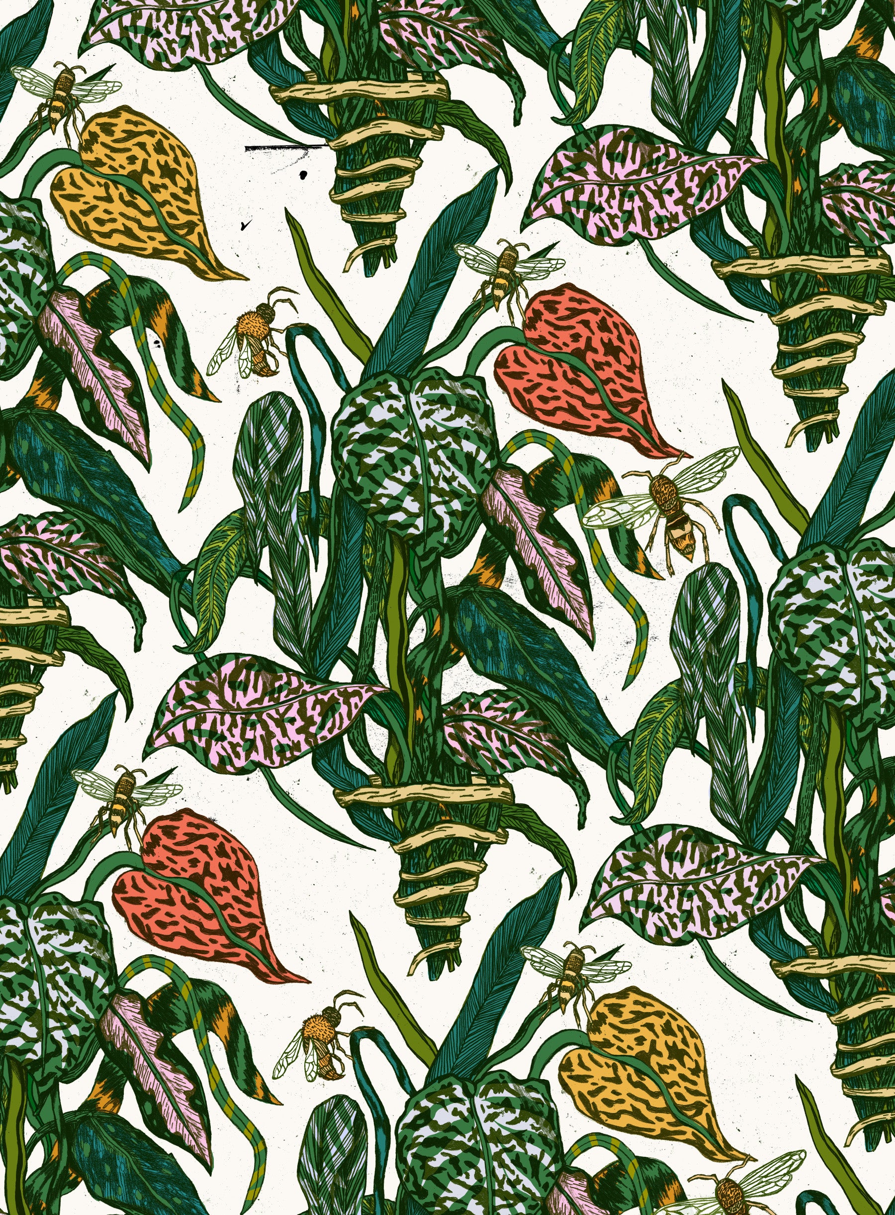 Invite nature into your space with this lively botanical wallpaper. This engaging design features detailed leaves and buzzing bees in a colorful arrangement. It offers a charming aesthetic perfect for any room. Transform your space using wallpaper for walls to create an inviting atmosphere. The design's playful essence complements bedrooms, living rooms, and entryways, adding charm and a touch of whimsicality to any interior.