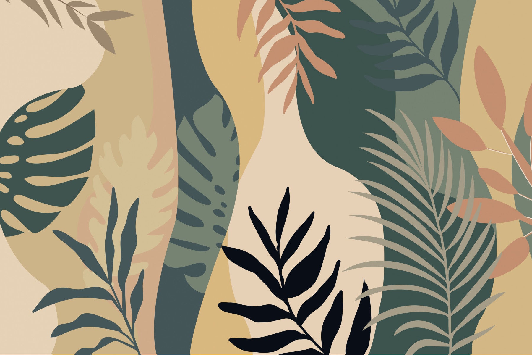 Invite nature indoors with this elegant botanical design. Neutral tones blend effortlessly with deep greens and contrasting black foliage. The stylized leaf patterns create a modern, tranquil ambiance, perfect for a living room, bedroom, or hallway. Choose this wallpaper for walls to complement your decor and add a touch of sophistication to any space. The abstract shapes in soft browns bring warmth and character to the interiors.