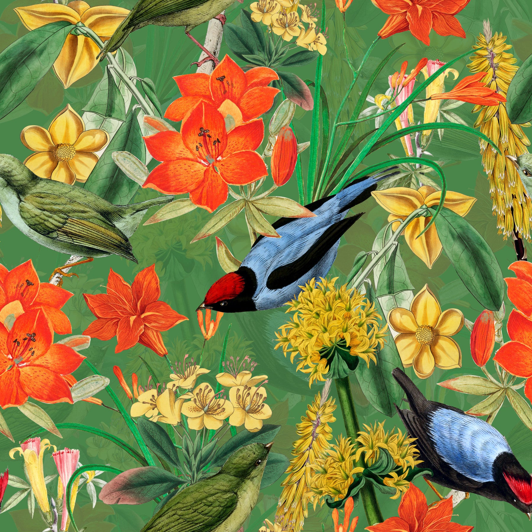 Immerse yourself in the vibrant hues and intricate details of 'Botanical Birdsong'. This wallpaper transports you to a lush, tropical paradise teeming with life. Exquisitely rendered birds, in shades of teal and olive green, flit amongst a profusion of fiery orange lilies, sunshine-yellow blossoms, and deep green foliage. The seamless pattern creates a sense of endless natural beauty, perfect for adding a touch of exotic elegance to any room. The rich colours and detailed botanical illustrations make this a striking and sophisticated choice for those who appreciate a touch of classic artistry blended with a modern aesthetic. Ideal for adding a calm yet uplifting atmosphere to your home.