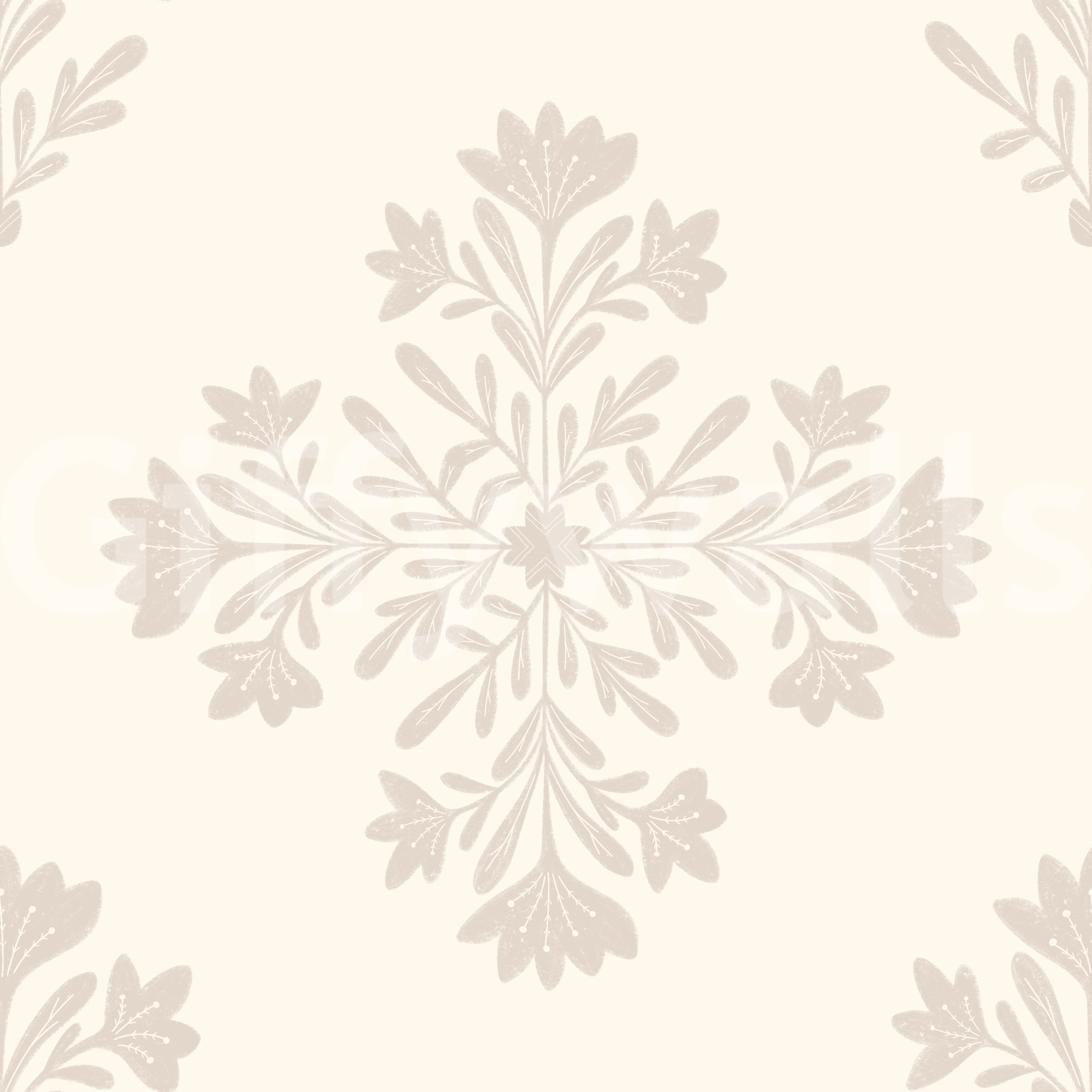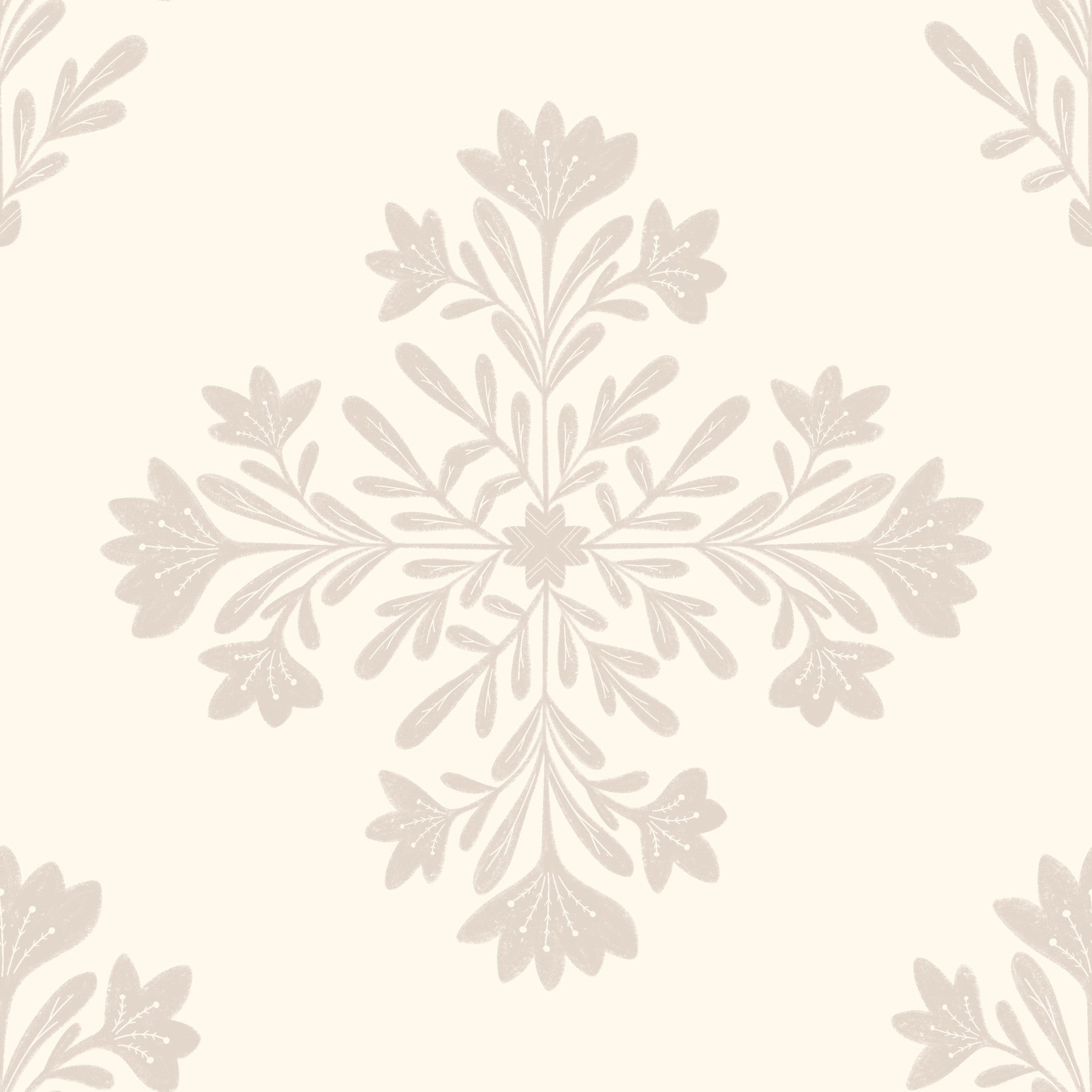 This wallpaper features a sophisticated damask pattern reimagined with a soft, blush-toned botanical print. The delicate floral motifs are artfully arranged in a repeating pattern, creating a sense of understated elegance. The pale beige and cream color scheme exudes calm and tranquility, making it ideal for spaces where relaxation is desired. Its hand-drawn style lends a touch of whimsy, while the overall design remains refined and sophisticated, perfect for bedrooms, living rooms, or any space needing a touch of quiet luxury.